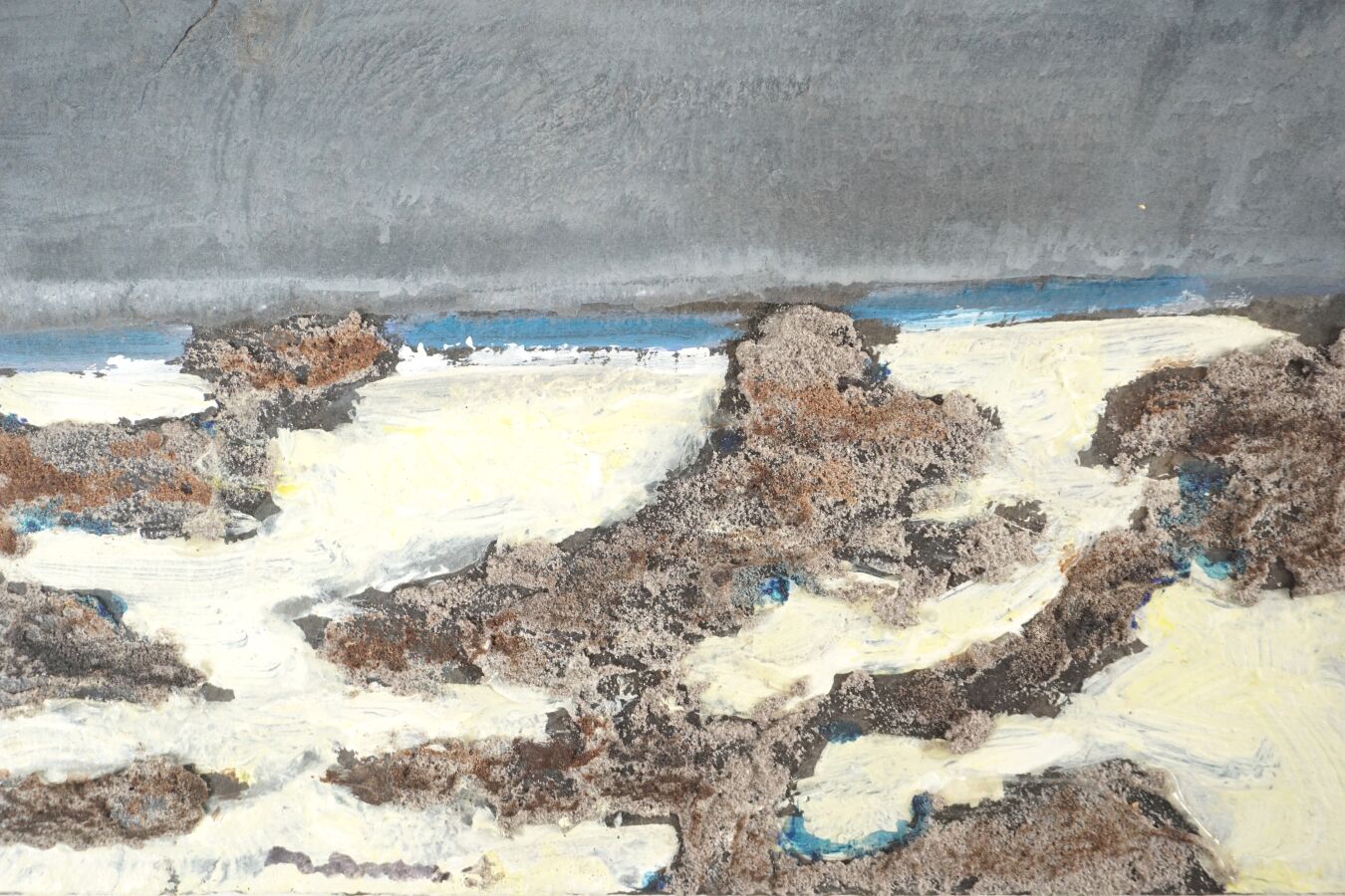 Jean-Jacques MORVAN (1928-2005), "Rochers sur la plage" 2004, huile et technique mixte sur ardoise, signée à l'ancre de marine en bas à gauche, contresignée, datée et titrée au dos, 19.3 x 29.5 cm.