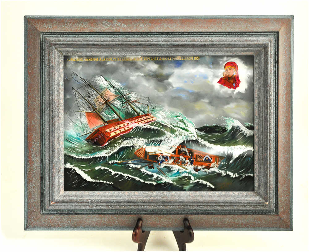 Jean LE GOFF (1925), "Algésiras, un homme à la mer perd la baleinière dépêchée & douze hommes, 9 août 1831" 1996, fixé sous verre signé et daté en bas à droite, 32 x 23 cm.