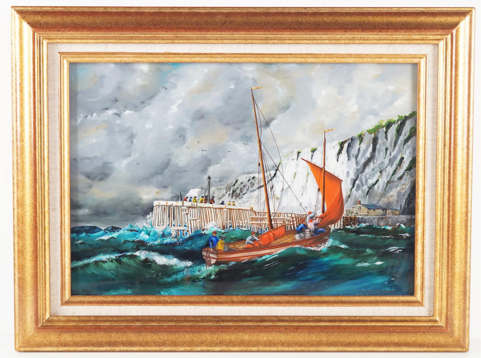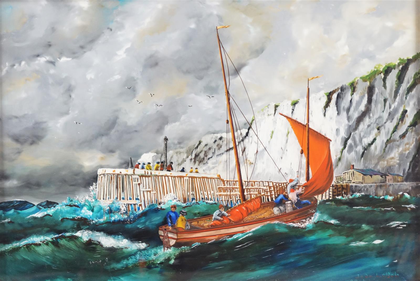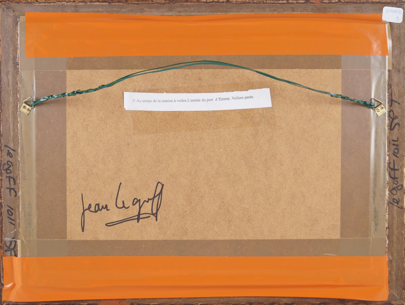 Jean LE GOFF (1925), "Au temps de la marine à voiles, l'entrée du port d'Etretat, voilure parée", fixé sous verre signé en bas à droite, 23.7 x 33.5 cm.