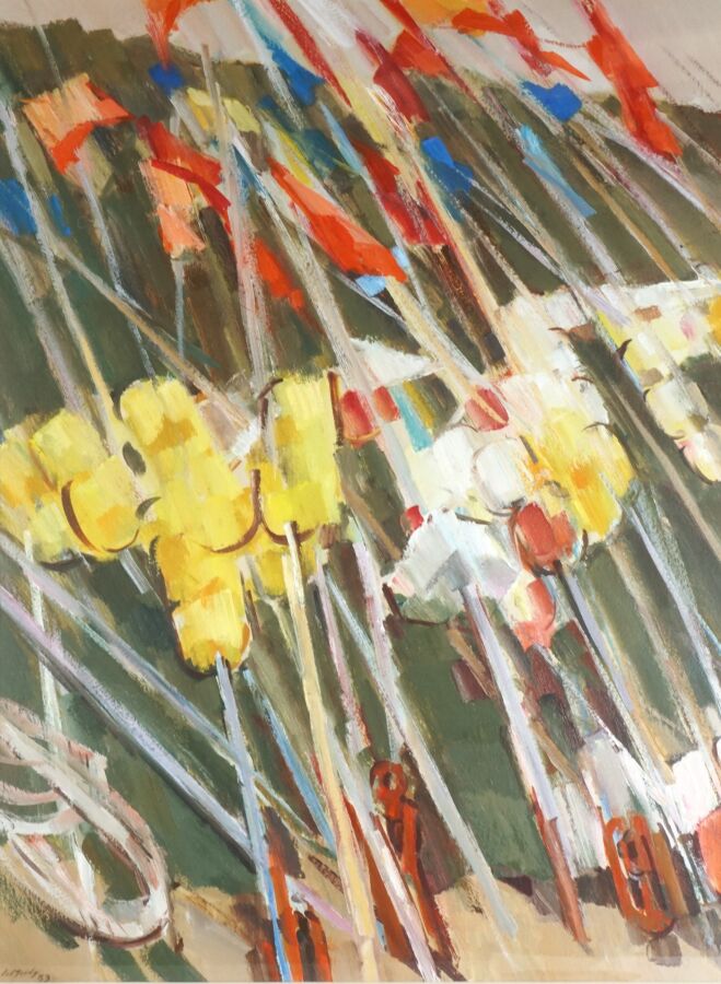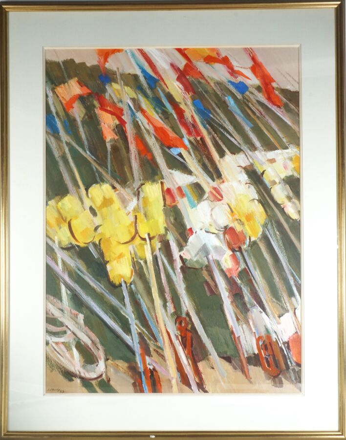 Jean LE MERDY (1928 - 2015), "Les drapeaux sur le port de Trévignon" 83, gouache sur papier, signée et datée en bas à gauche, 73.5 x 54 cm (à vue).