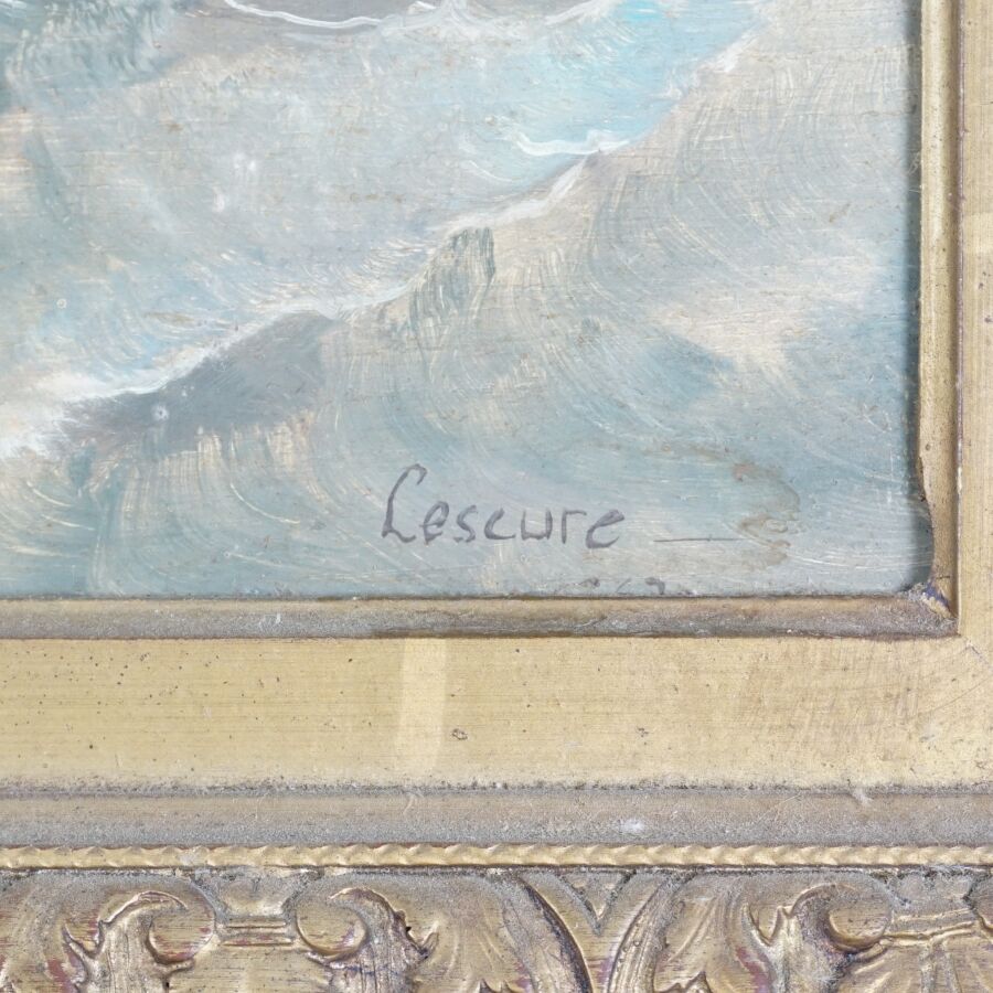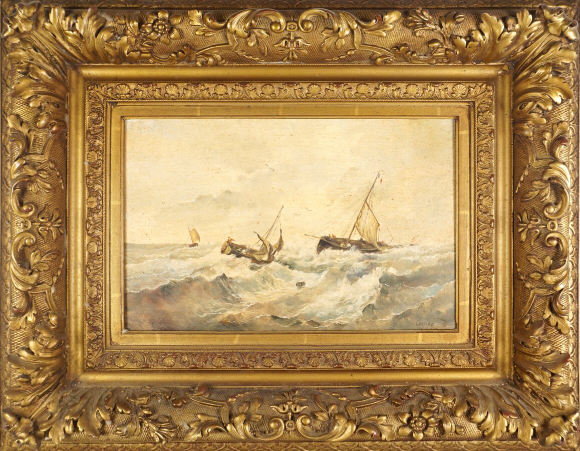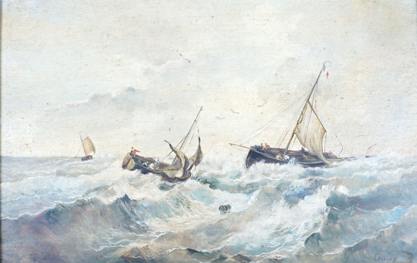 Jean LESCURE (1934), "Pêche par mer agitée", huile sur panneau signée en bas à droite, 28 x 40 cm.
