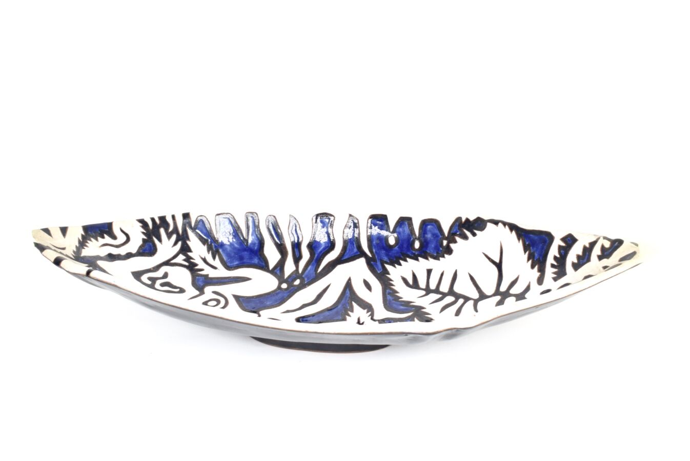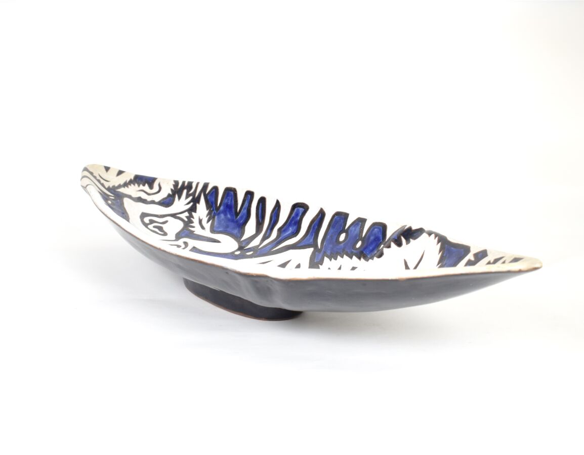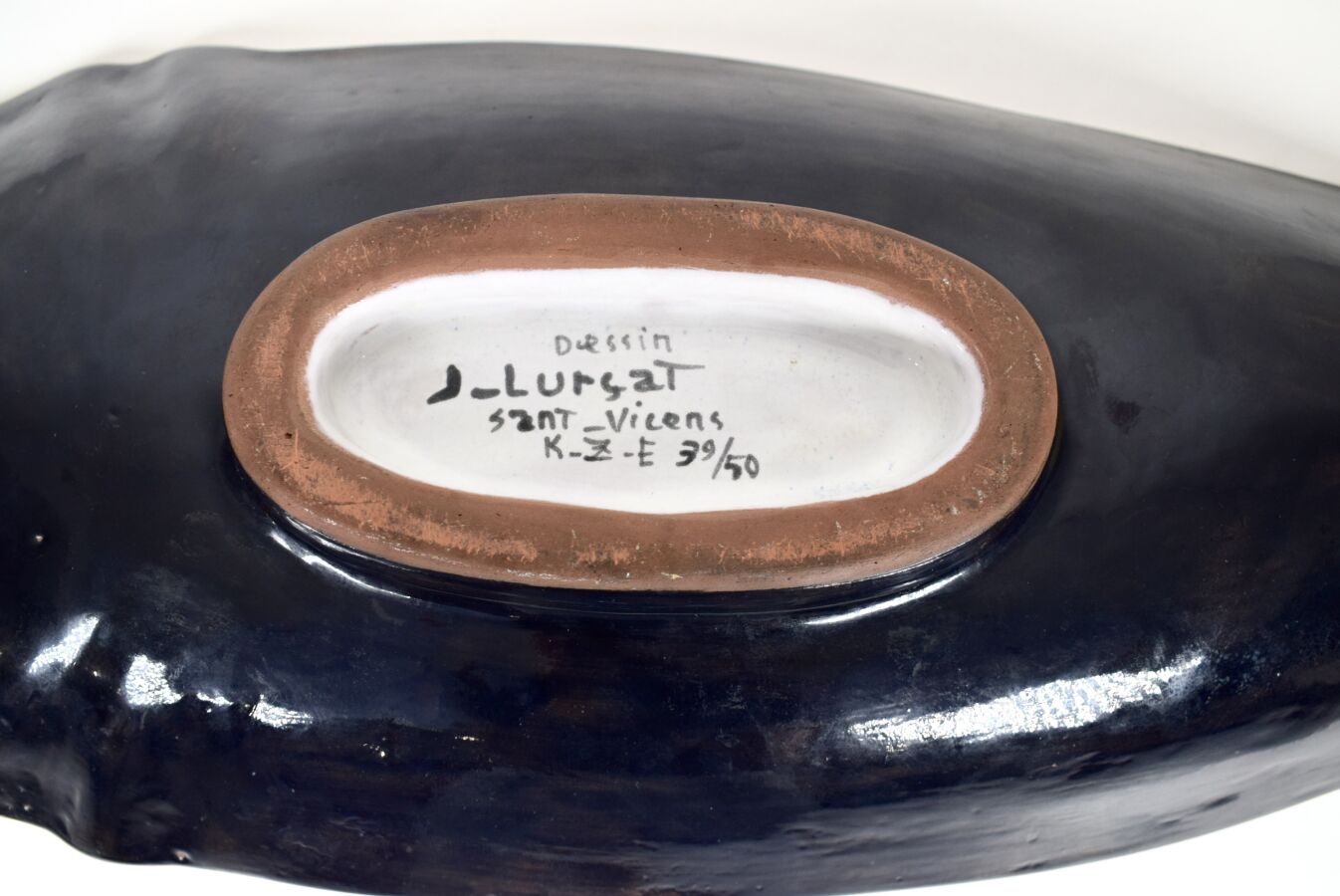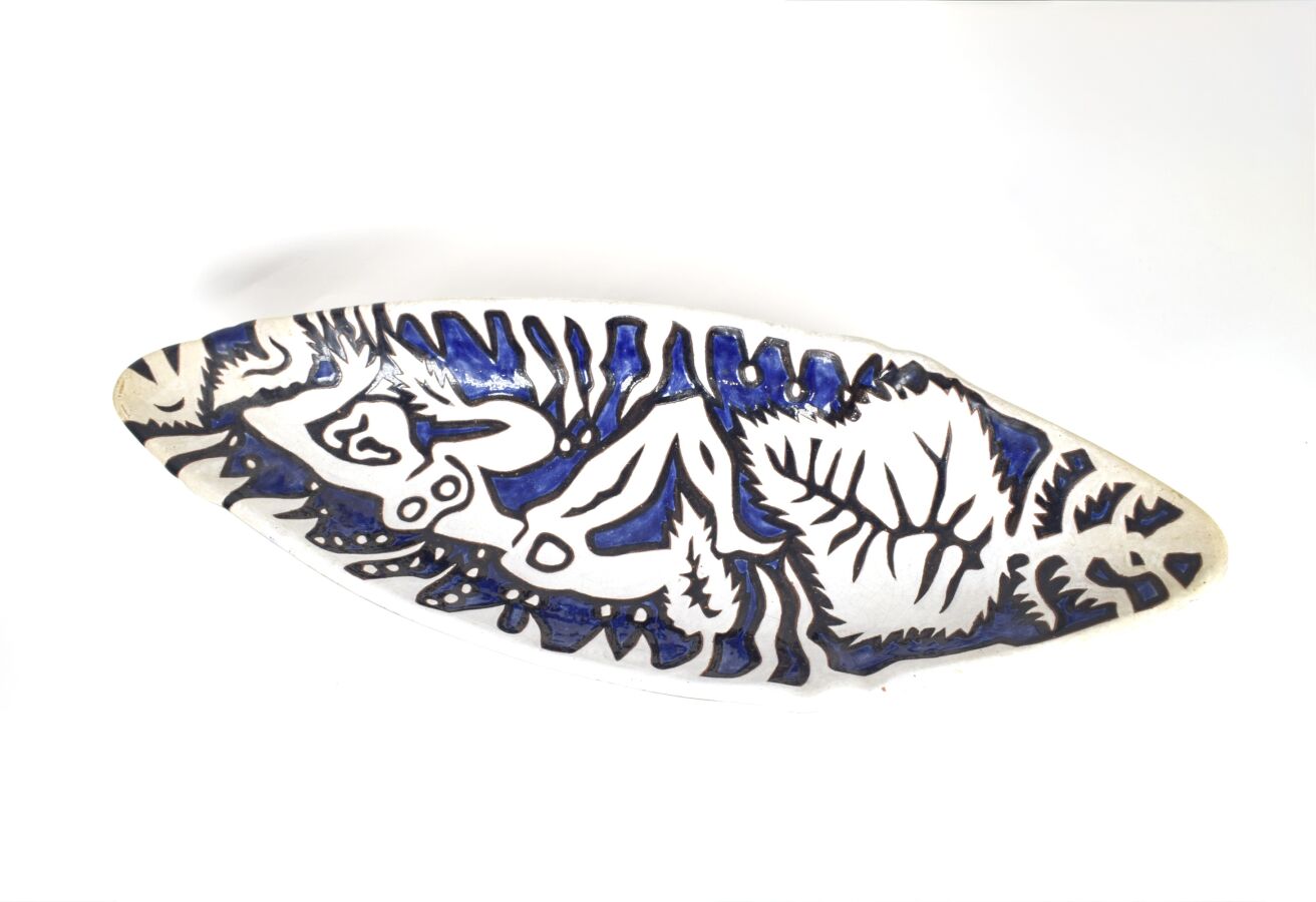 Jean LURCAT (1892-1962) pour Saint-Vicens : Grande coupe de forme oblongue en céramique émaillée, circa 1950/1960, orné d'un motif central stylisant une danseuse dans un décor bleu cobalt et noir sur fond blanc, signée et numérotée KZE 39/50, H. 7.5 cm - Long. 62 cm.