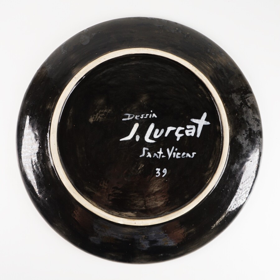Jean LURCAT (1892-1966) pour SANT-VICENS : Grand plat en céramique émaillée polychrome à décor de visages sur fond vert et brun, signé et numéroté 39 au dos, D. 40 cm (infimes égrenures).
