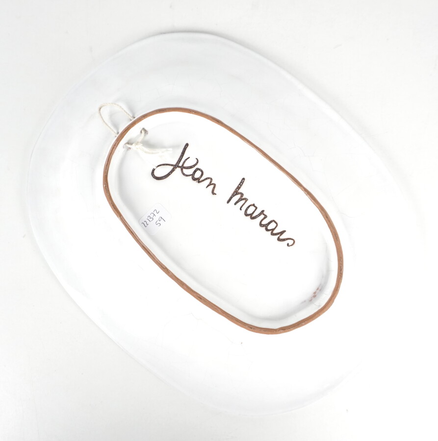 Jean MARAIS (1913-1998), "Visages", plat de forme ovale en terre cuite vernissée blanche - ivoire, signé en bas et contresigné au dos, L. 33.2 cm.