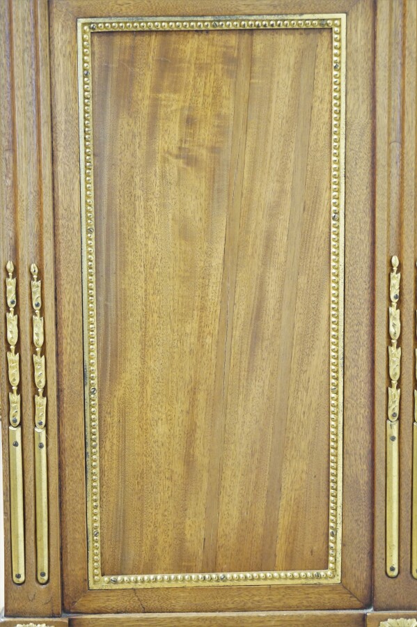 Jean-Martin SCHILER (reçu maître en 1781) : Secrétaire Louis XVI en acajou et placage d'acajou ouvrant à un tiroir surmontant un abattant découvrant 6 tiroirs et plusieurs casiers, le plateau garni d'un maroquin vert, 2 vantaux en partie basse, pieds toupies, montants carrée à cannelures rudentées, riche et belle ornementation de bronzes dorés et ciselés à décor de frises de perles, joncs rubanés, frises de postes, entrées de serrures, bagues et sabots feuillagés. Estampillé JM SCHILER sur 3 montants, 18e siècle, coiffé d'un marbre blanc probablement rapporté, 79 x 37 x H. 141.5 cm (avec sa clé modèle "triangle", quelques fentes restaurées sur les côtés, fentes du placage sur l'abattant et les vantaux, un petit accident au coin du marbre taché, rayures à l'intérieur dans un casier, le cuir en l'état).