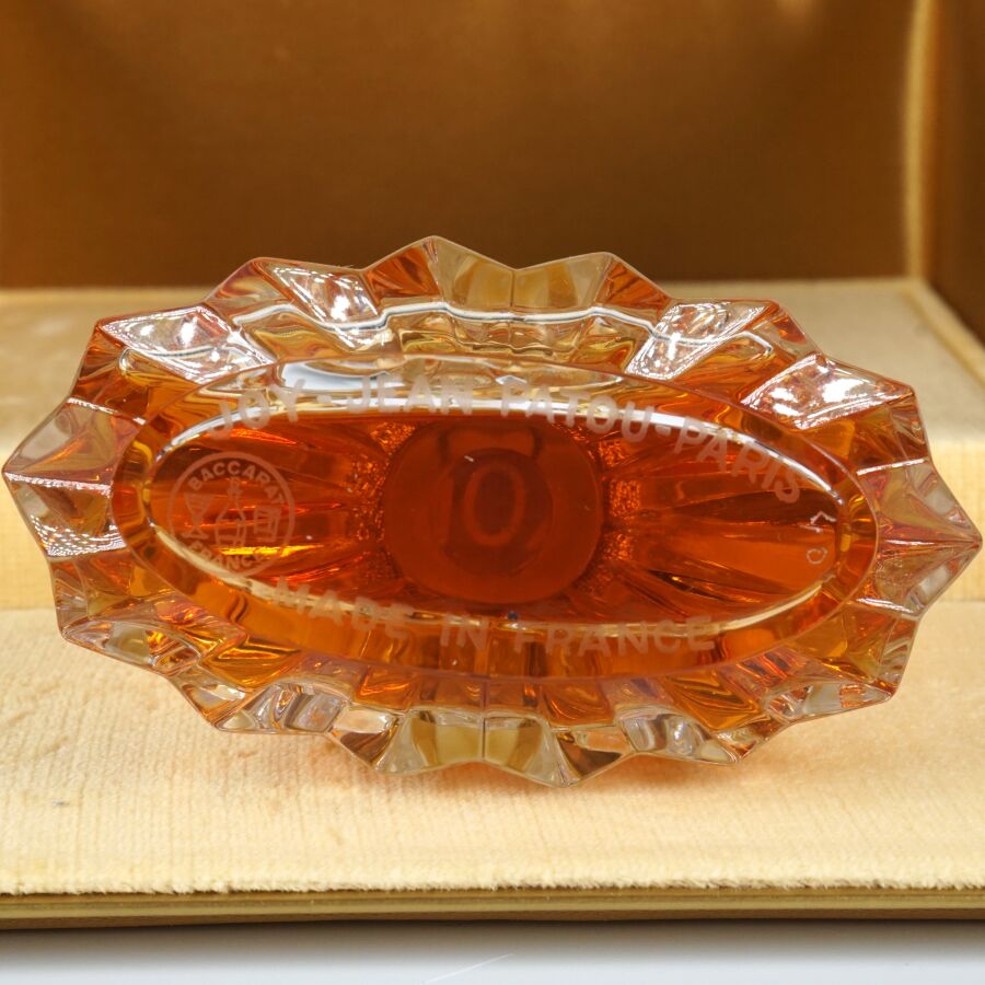 JEAN PATOU - BACCARAT : "Joy" (1930), flacon "crinoline" en cristal incolore moulé pressé de section ovale, sa panse à décor moulé de losanges, bouchon conique tronqué rainuré sur sa tranche, scellé, présenté dans son emboîtage d'origine en carton gainé de satin chamois, intérieur velours jaune pâle, H. 6.3 cm (PDO).
