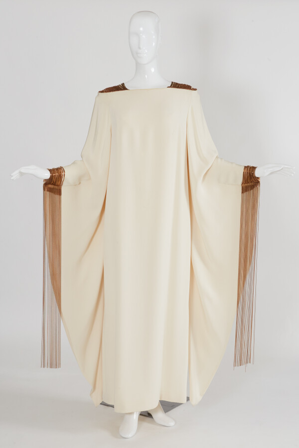 Robe droite en crêpe de soie, grandes manches bordées de strass et de franges métalliques or.
