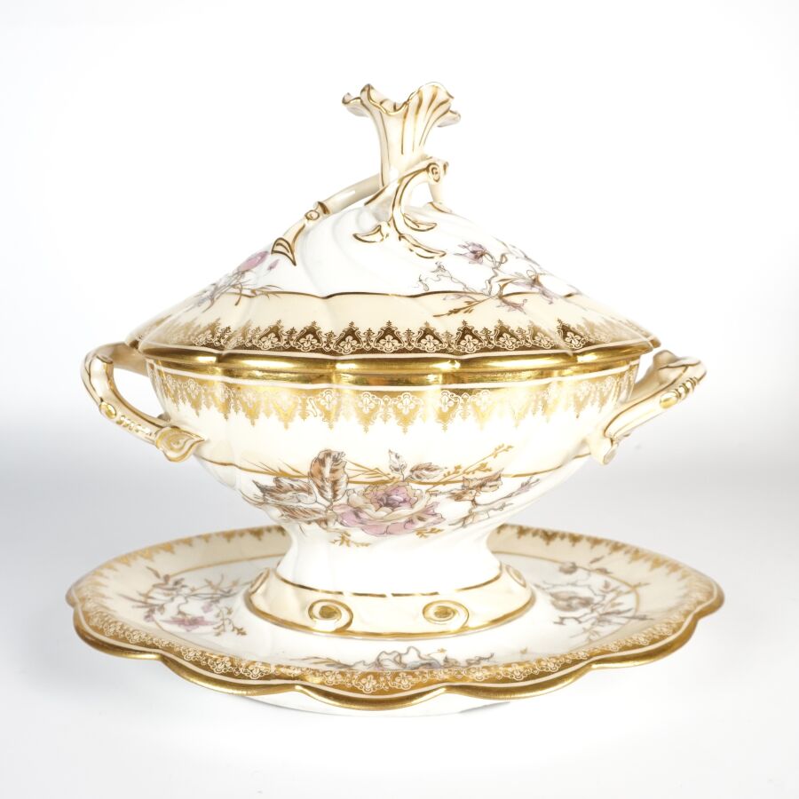 JEAN POUYA - LIMOGES : Service de table en porcelaine émaillée polychrome et rehaut d'or circa 1880 à décor en plein de feuillages et jetés de fleurs, l'aile à décor de lambrequins sur fond beige, comprenant : 2 présentoirs (D. 21 cm), 2 coupes (D. 24 et 22 cm), 1 saucière (21 x 24 cm) et 30 assiettes (D. 21 cm), circa 1880, marqué au revers (égrenures, quelques éclats).