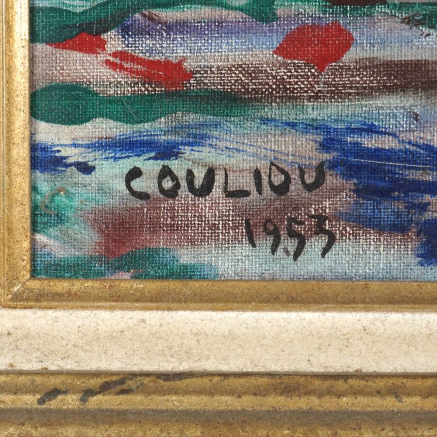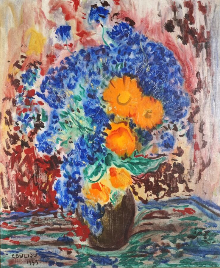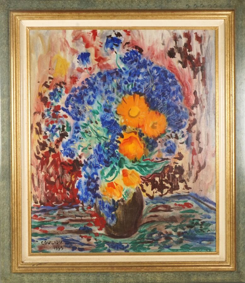 Jean-Yves COULIOU (1916-1995), "Nature morte au bouquet de fleurs" 1953, huile sur toile signée et datée en bas à gauche, 55 x 46 cm.