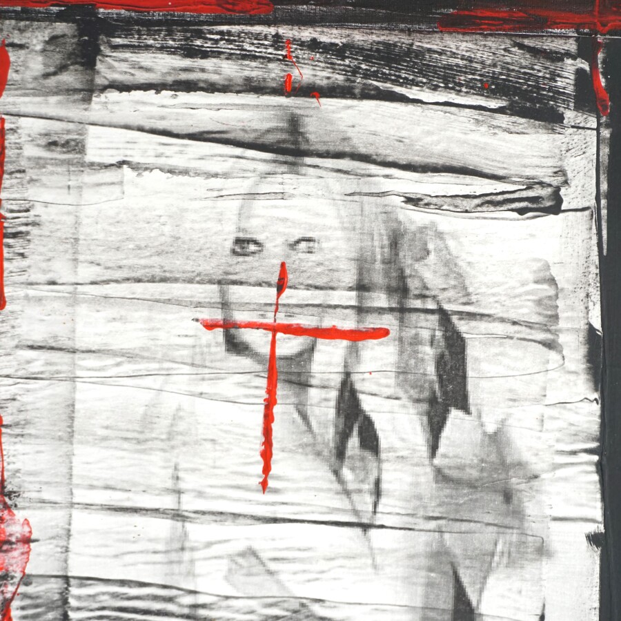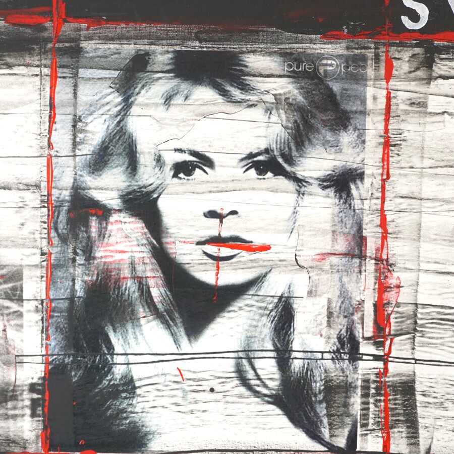 Jeff CALLEC (XX-XXIe), "Sex Symbol " Novembre 2009, technique mixte et collage sur toile, signée en bas à droite, 100 x 100 cm.
