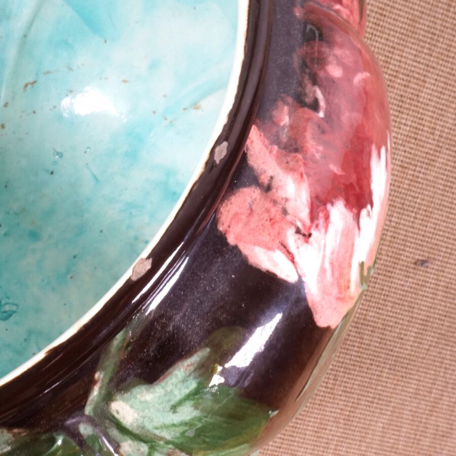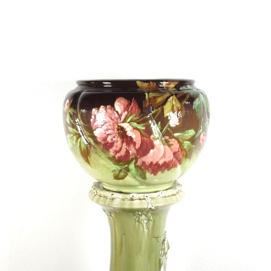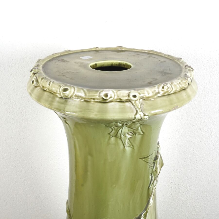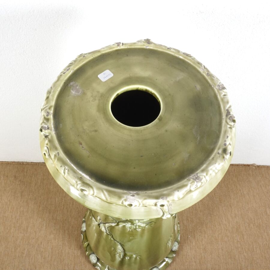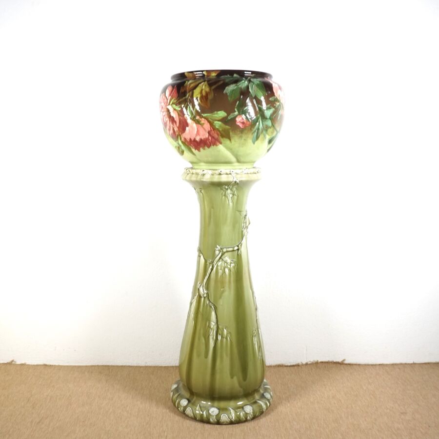 Jérôme MASSIER (1850-1916) - VALLAURIS : Jardinière pansue en faïence émaillée polychrome à décor de fleurs, avec son socle tronconique en faïence émaillée vert à décor en bas-relief de feuillage, signé dessous, H. Totale : 125.5 cm. H. Socle : 92.5 cm (petits sauts d'émail et légers éclats).