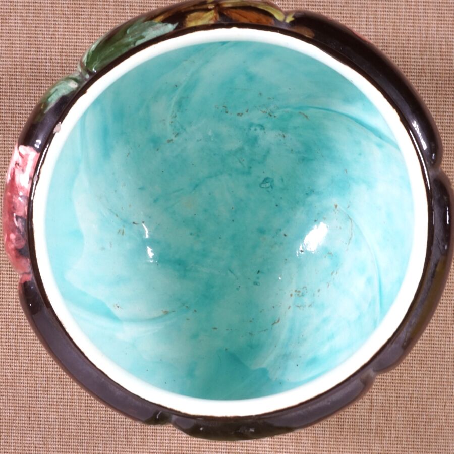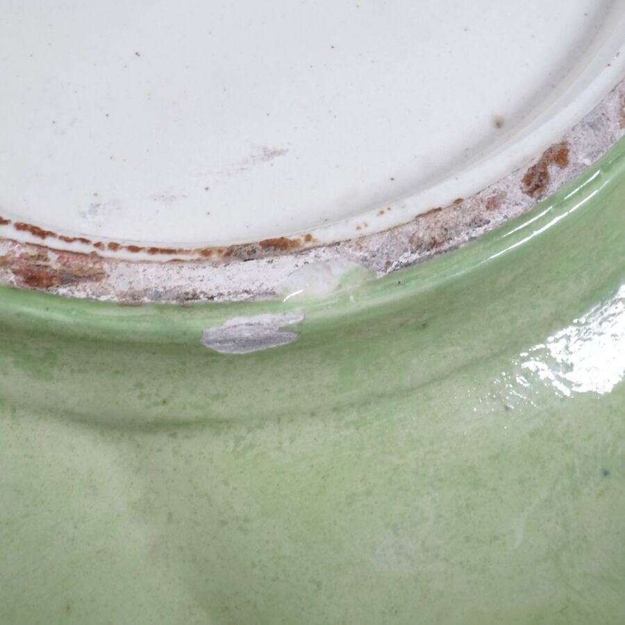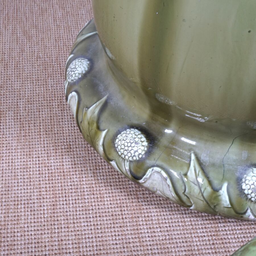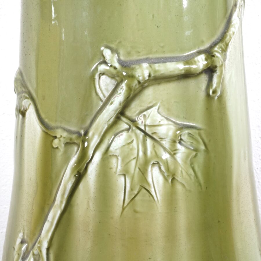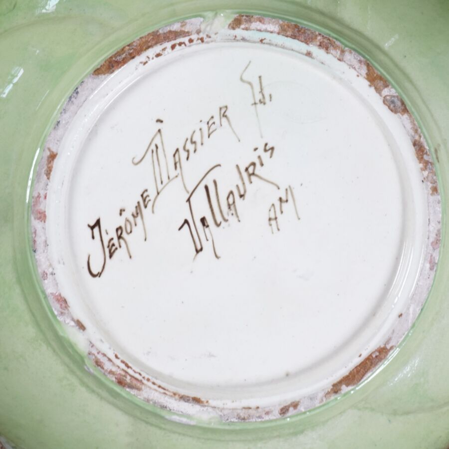 Jérôme MASSIER (1850-1916) - VALLAURIS : Jardinière pansue en faïence émaillée polychrome à décor de fleurs, avec son socle tronconique en faïence émaillée vert à décor en bas-relief de feuillage, signé dessous, H. Totale : 125.5 cm. H. Socle : 92.5 cm (petits sauts d'émail et légers éclats).