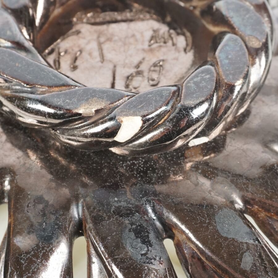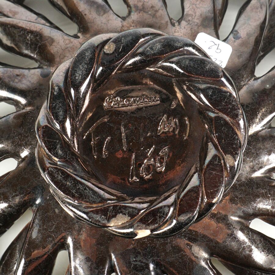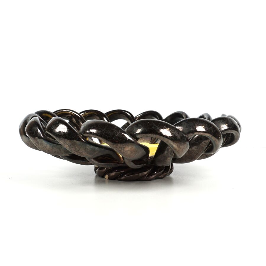 Jérôme MASSIER (1850-1926) - CERAMIDI : Coupe "Rosace" en faïence émaillée en brun à bordure ajourée et tressée, le bassin de couleur jaune, circa 1970, signée, D. 30 cm (éclat à la base).