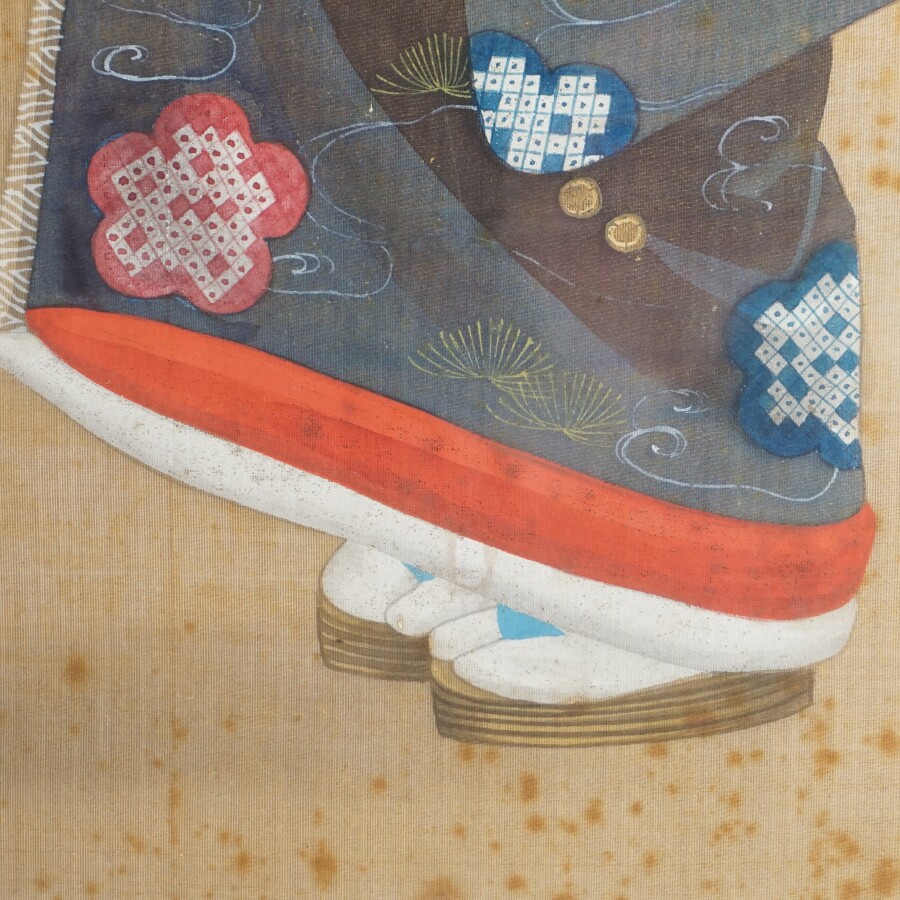 Jeunes femmes en habits traditionnels, deux encres et couleurs sur soie partiellement brodée et applications (technique mixte), Japon, début du 20ème siècle, 64 x 29 cm (rousseurs, petites déchirures à l'une).
