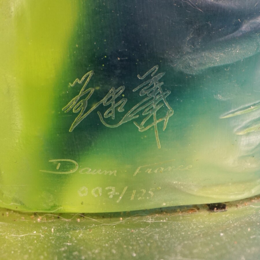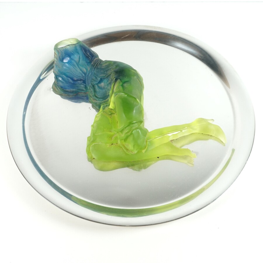 Jianhua LIU (1962) pour DAUM : "Souvenir d'Amour", sculpture en pâte de verre teinté bleu et vert à motif d'une femme, numérotée 007/125 et signée à la pointe, présentée sur un plateau en métal argenté, Diam : 50 cm.