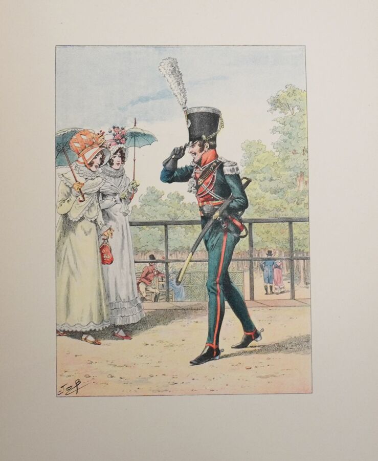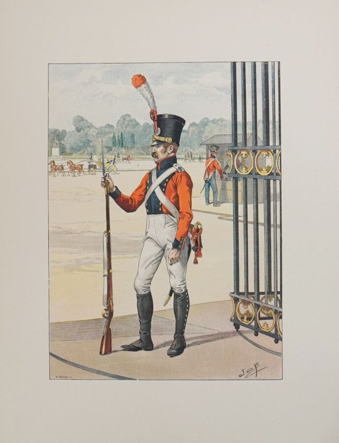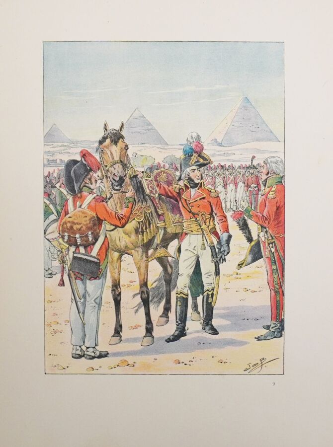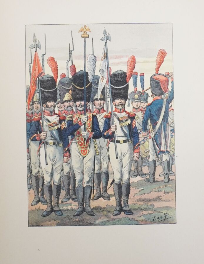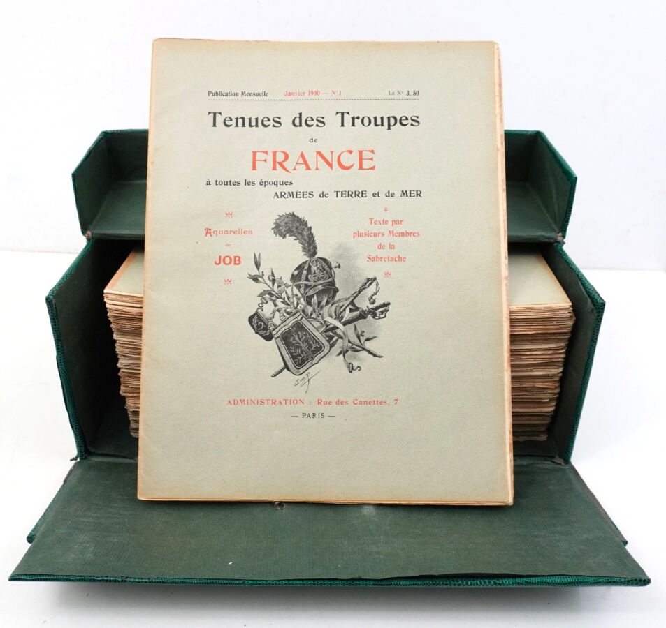 JOB. Tenue des troupes de France, à toutes les époques. Armées de Terre et de Mer. Paris, Martin, Combet & Leroy, 1900-1904. 48 fascicules (325 x 250 mm), 4 ff. et 4 pl. chacun. En ff., en partie non coupées, couvertures de livraisons pour la première et la dernière année, couverture générale pour les deux autres, boîte de simili-peau de reptile verte.