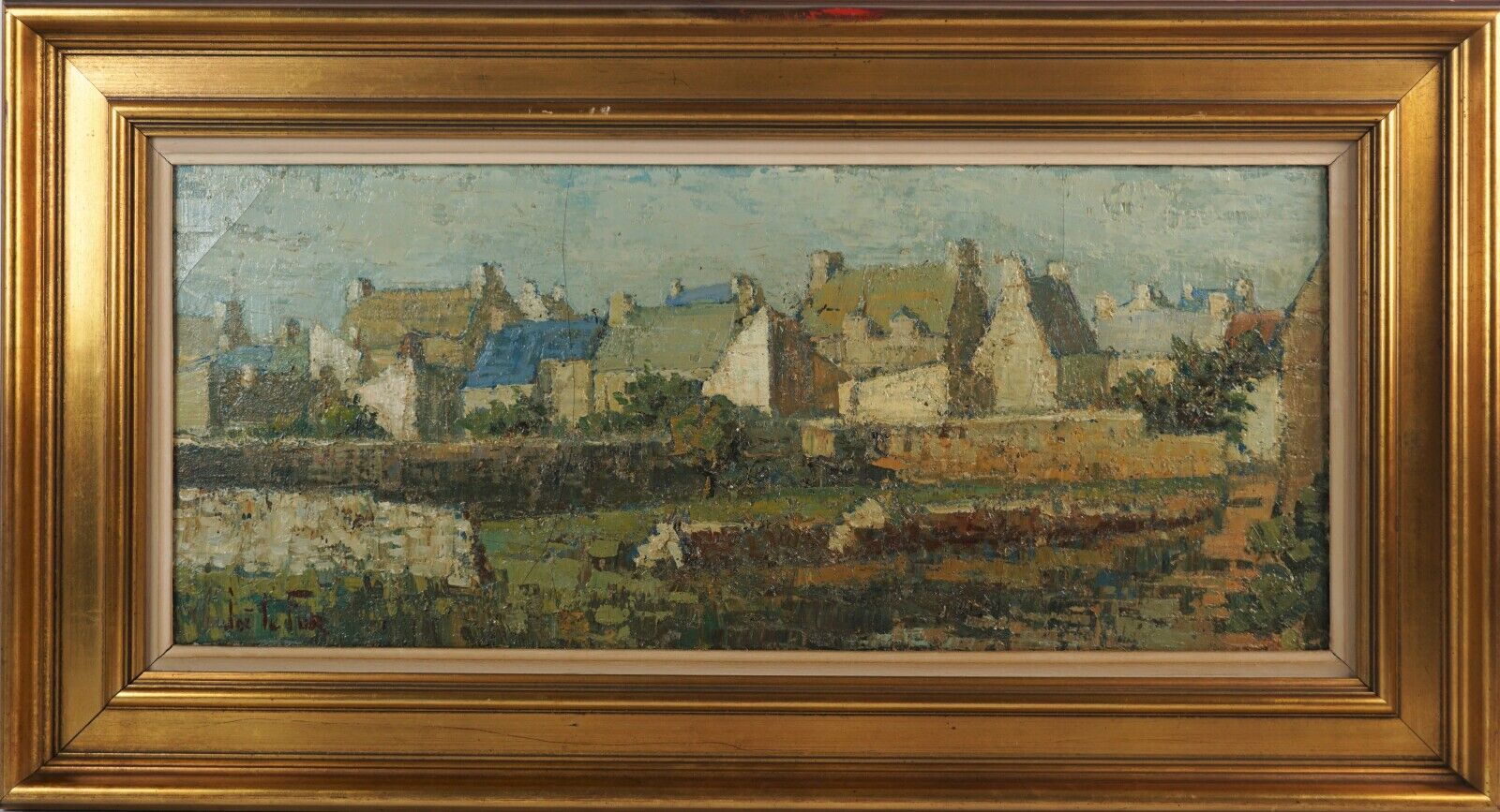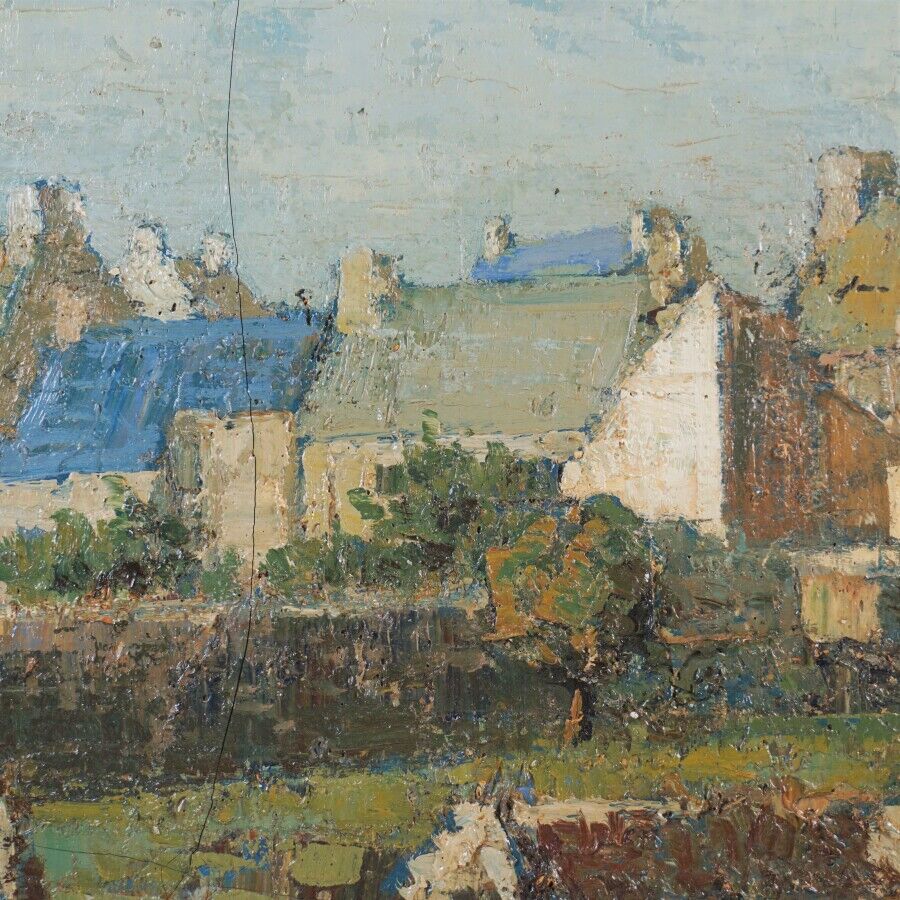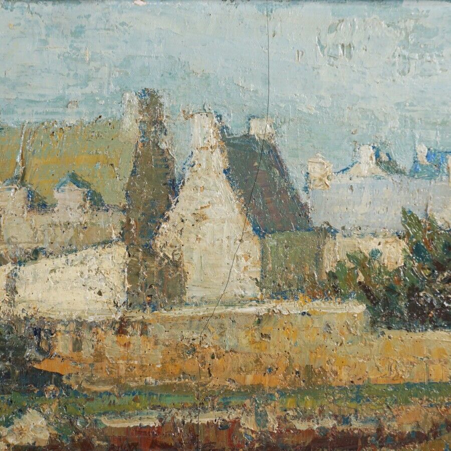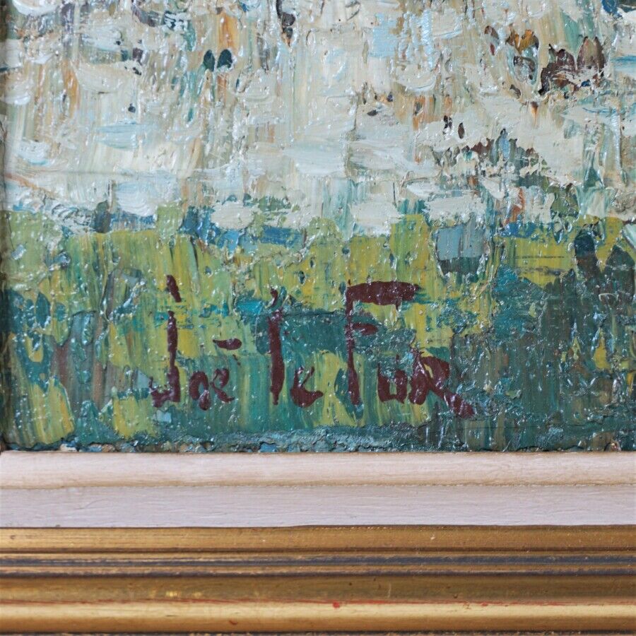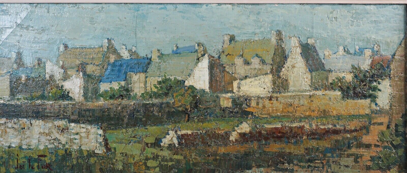 Joë LE FUR (1920-2001), "A l'orée du village", huile sur toile, signée en bas à gauche, 26 x 61 cm (craquelures).