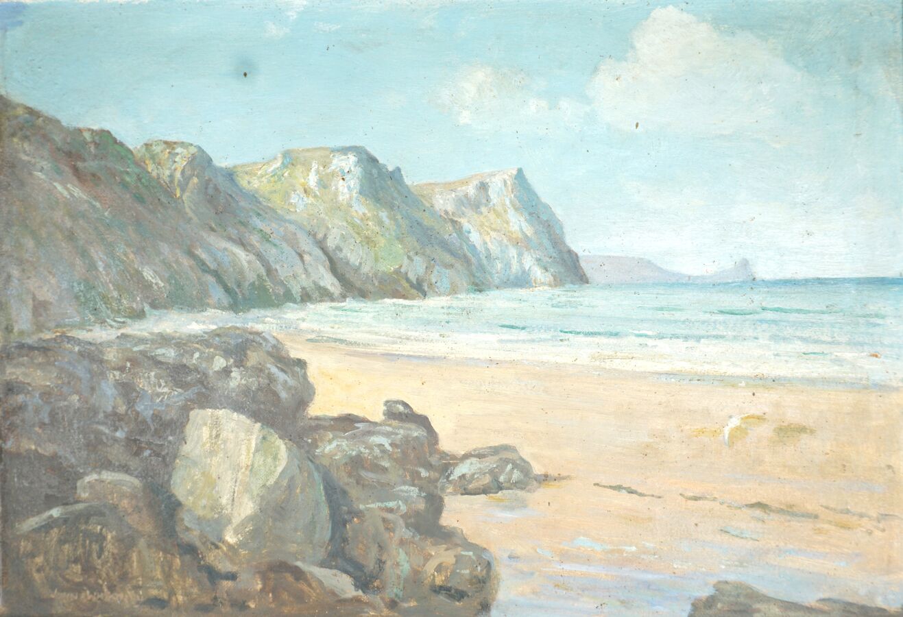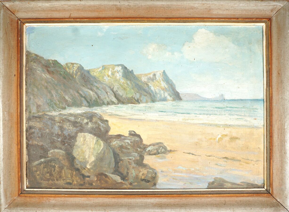 John Laviers WHEATLEY (1892-1955), "Falaises sur la plage", huile sur carton fort signée en bas à gauche, 38 x 55 cm.