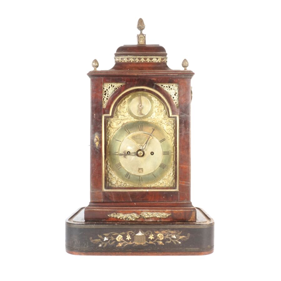 JOHN TAYLOR LONDON : Pendule à poser de forme borne dite "religieuse", bois, acajou et placage d'acajou, cadran en métal doré, chiffres romains pour les heures, chiffres arabes pour les minutes, mouvement signé, guichet dateur en bas, mouvement à quantièmes et sonnerie à répétition par cordon de tirage, les côtés ornés d'une plaque en métal ajouré à motif feuillagés et de mascarons, surmonté de quatre pommes de pain aux angles et d'une pomme de pin centrale, la platine arrière gravée, avec un socle en bois noirci rapporté, Angleterre, fin 18ème - début 19ème siècle, H. Hors socle : 53 cm (avec clé, manques et sauts au placage, usures, plaque latérale droite à refixer, serrure vitre avant à revoir).