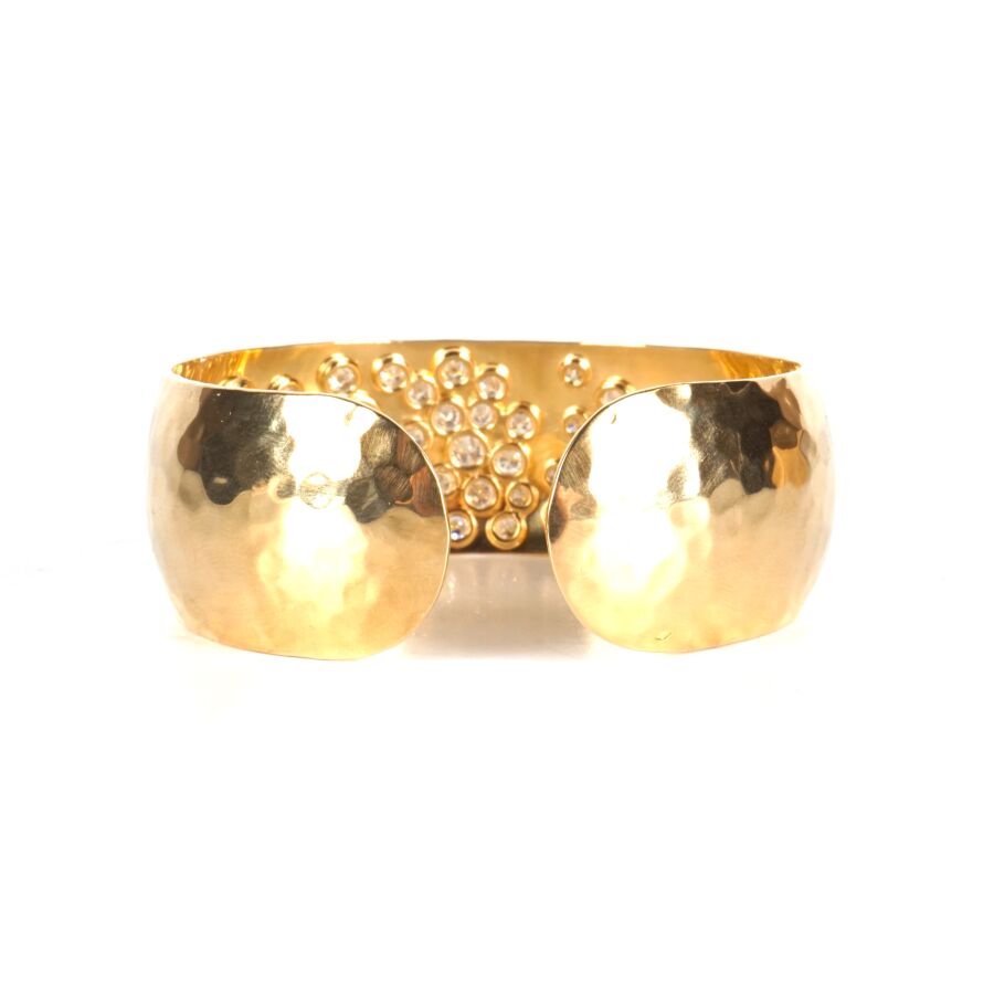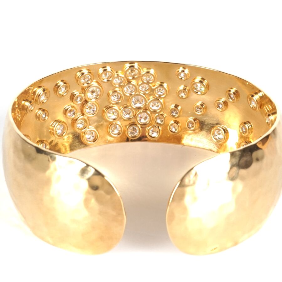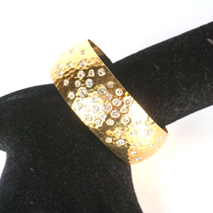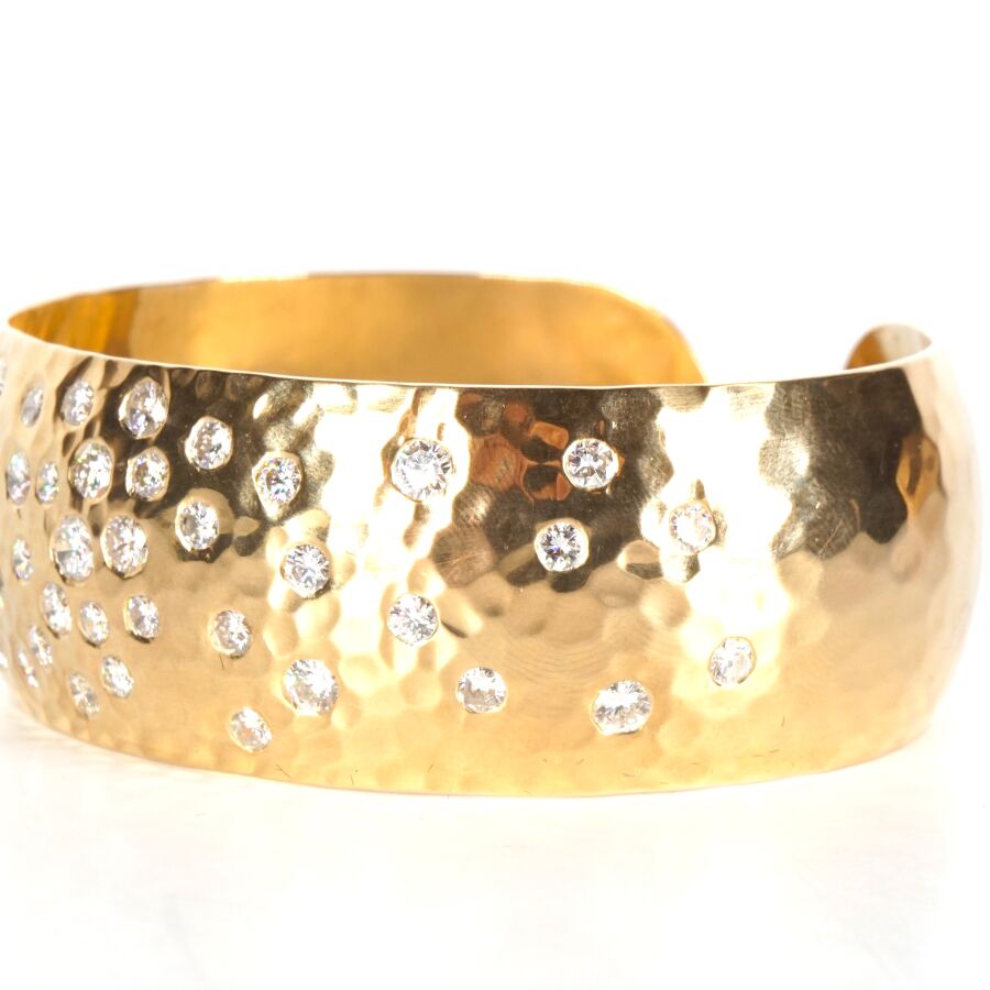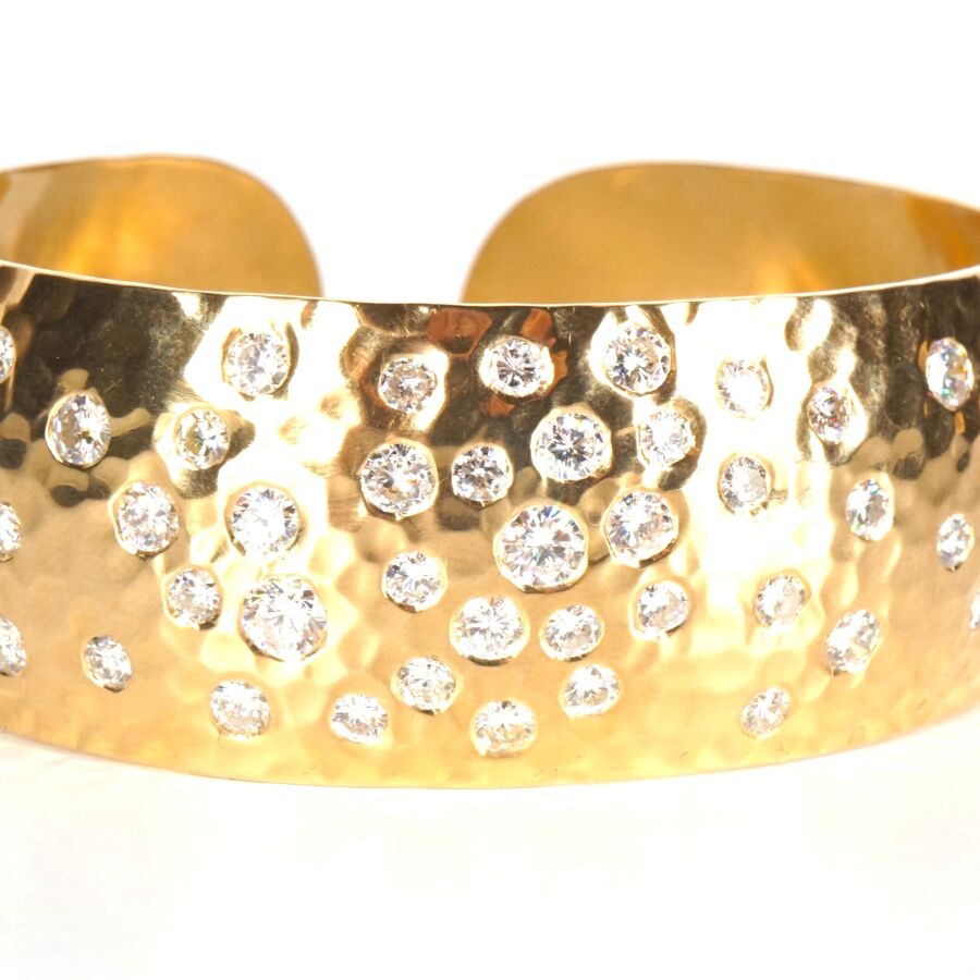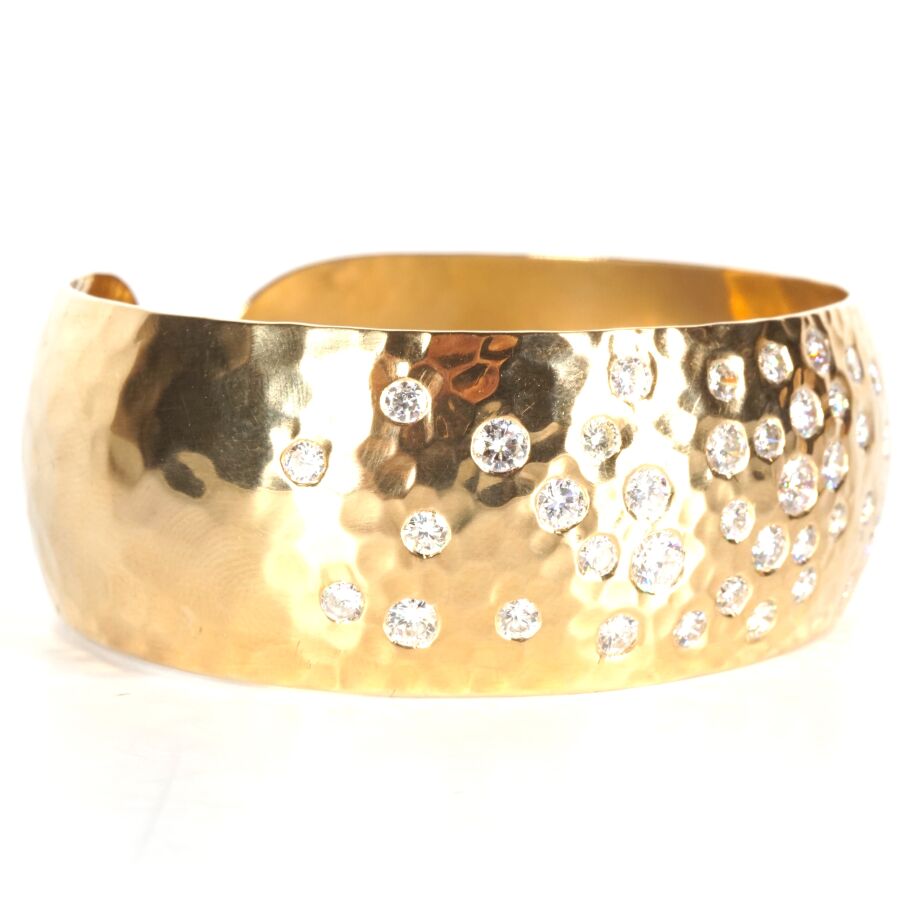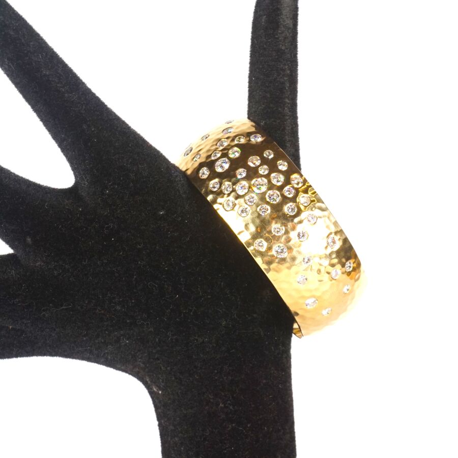 Joli bracelet manchette or jaune 18K (750/oo) martelé serti de 46 diamants moderne taille brillant calibrant au total 3.5 ct environ (de 0.05 ct à 0.23 ct chaque), couleur supposée F/G, Larg. 2.2 cm. L. Intérieure : 5.9 cm. Poids brut : 47.6 g environ.