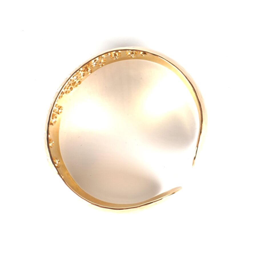 Joli bracelet manchette or jaune 18K (750/oo) martelé serti de 46 diamants moderne taille brillant calibrant au total 3.5 ct environ (de 0.05 ct à 0.23 ct chaque), couleur supposée F/G, Larg. 2.2 cm. L. Intérieure : 5.9 cm. Poids brut : 47.6 g environ.