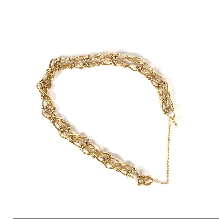 Joli bracelet souple en or jaune 18K (750/oo), formé de 2 rangs de maillons en 8 noués, fermoir mousqueton avec chaine de sécurité, L. 19.5 cm. Poids brut : 15.9 g environ.