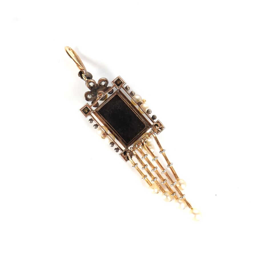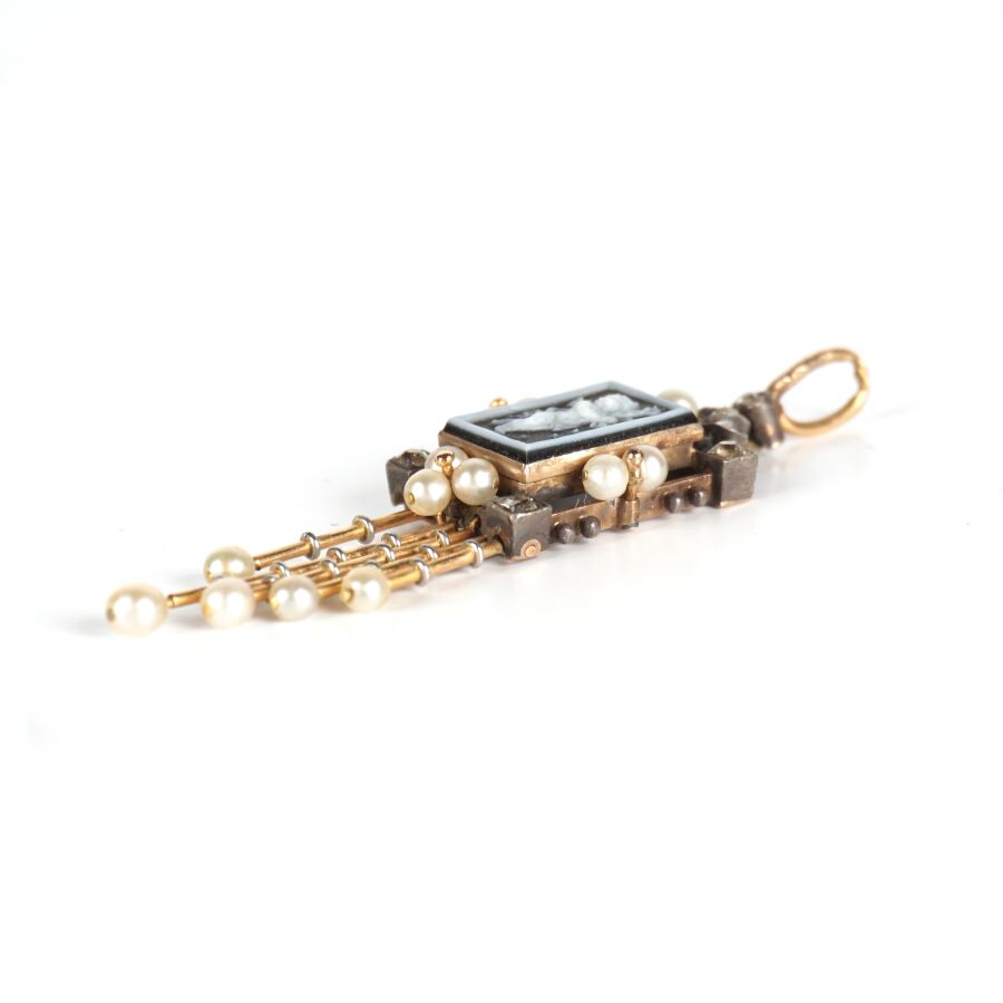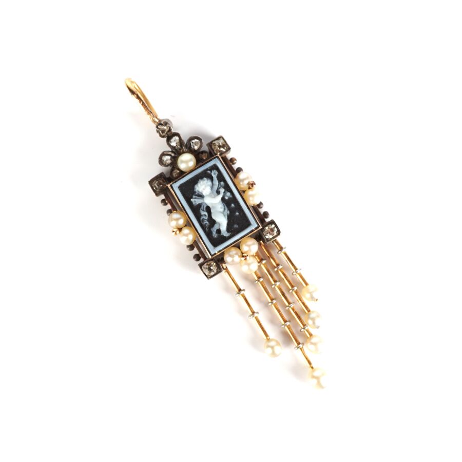 Joli pendentif en or jaune 18K (750/oo) serti au centre d'un camée probablement sur une plaque d'onyx noire de forme rectangulaire, figurant un angelot, encadré de 9 petits diamants taille rose et de 8 petites perles blanches (D. 2.7 mm), orné de 5 tiges d'or retenant chacun une petite perle blanche, travail de la fin du 19ème - début du 20ème siècle, H. Totale : 5.4 cm. Larg. 1.4 cm. Poids brut : 3.7 g environ (manque une tige).