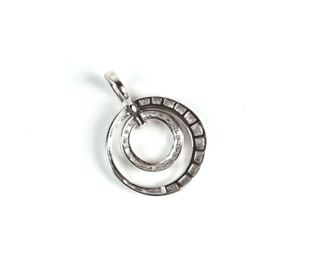 Joli pendentif rond ajouré en or blanc 18K (750/oo) formé de 2 cercles retenus par une agrafe, l'ensemble serti de diamants taille moderne et taille baguette, les pierres calibrant ensemble 0.40 ct environ, D. 1.5 cm, H. 2.5 cm. Poids brut : 2.75 g environ.