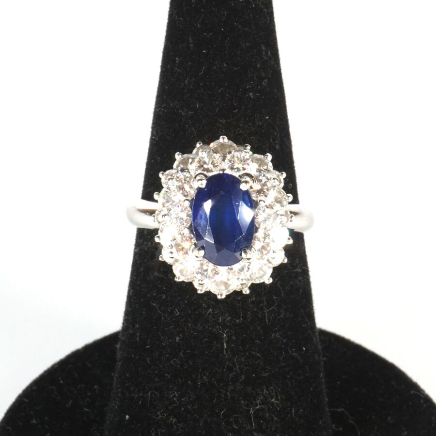 Jolie bague "Marguerite" en or gris 18K (750/oo), sertie au centre d'un saphir bleu de taille ovale calibrant 1.5 cts environ (D. 9 x 6 mm) dans un entourage sur trois niveaux de 30 diamants ronds calibrant au total 1.9 cts environ, Dim. Tête de bague : 1.7 x 1.4 cm. TDD. 56. Poids brut : 7.7 g environ.