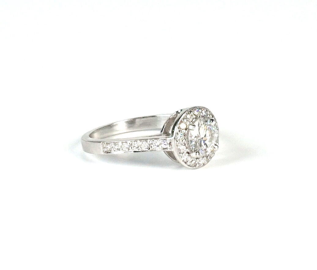 Jolie bague ronde en or gris 18K (750/oo), sertie au centre d'un diamant rond calibrant 0.9 carat environ, l'entourage et l'anneau sertis de petits diamants. TDD 54. Poids brut : 4.3 g environ.