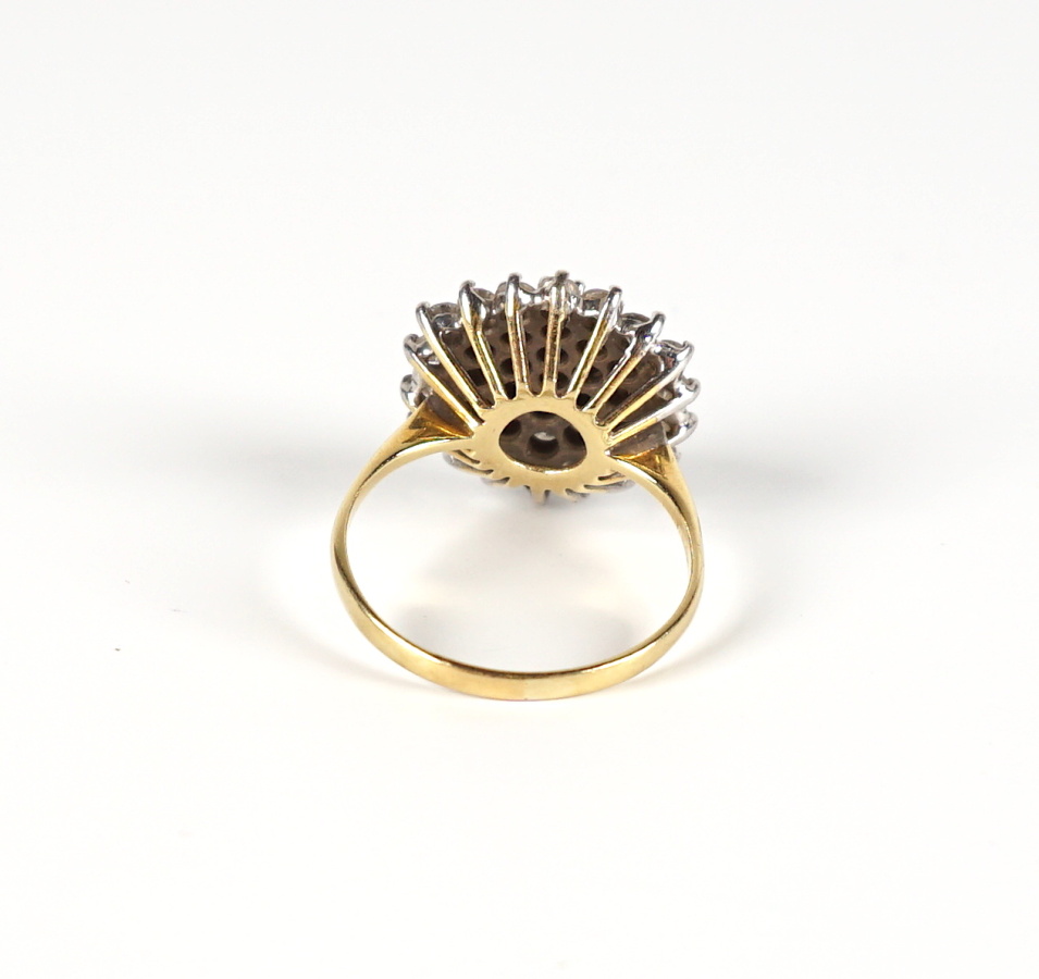 Jolie bague "Rosace" en or de deux tons 18 K (750/oo) ornée d'un pavage de petits diamants sertis griffes, disposés en dôme, pesant 0.07 ct chaque environ. TDD 56. Poids brut : 5.7 g environ.