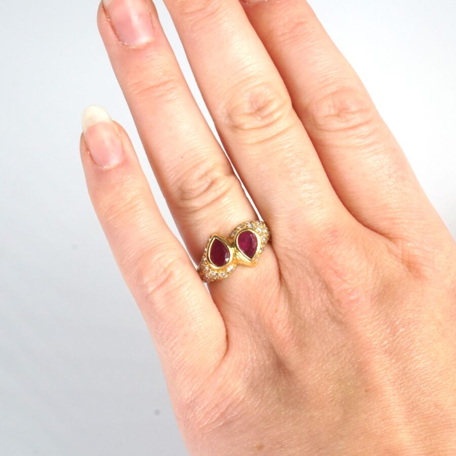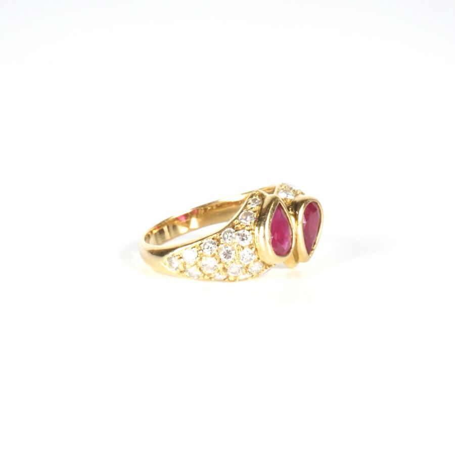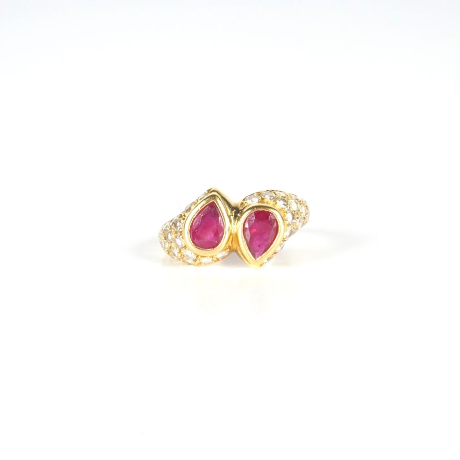 Jolie bague "Toi & Moi" en or jaune 18K (750/oo), sertie de deux rubis taille poire (D. 6 x 4.5 mm) dans un entourage de 2x16 diamants taille brillant calibrant au total 0.6 cts environ, Larg. Tête de bague : 1.1 cm. TDD. 52. Poids brut : 4 g environ.