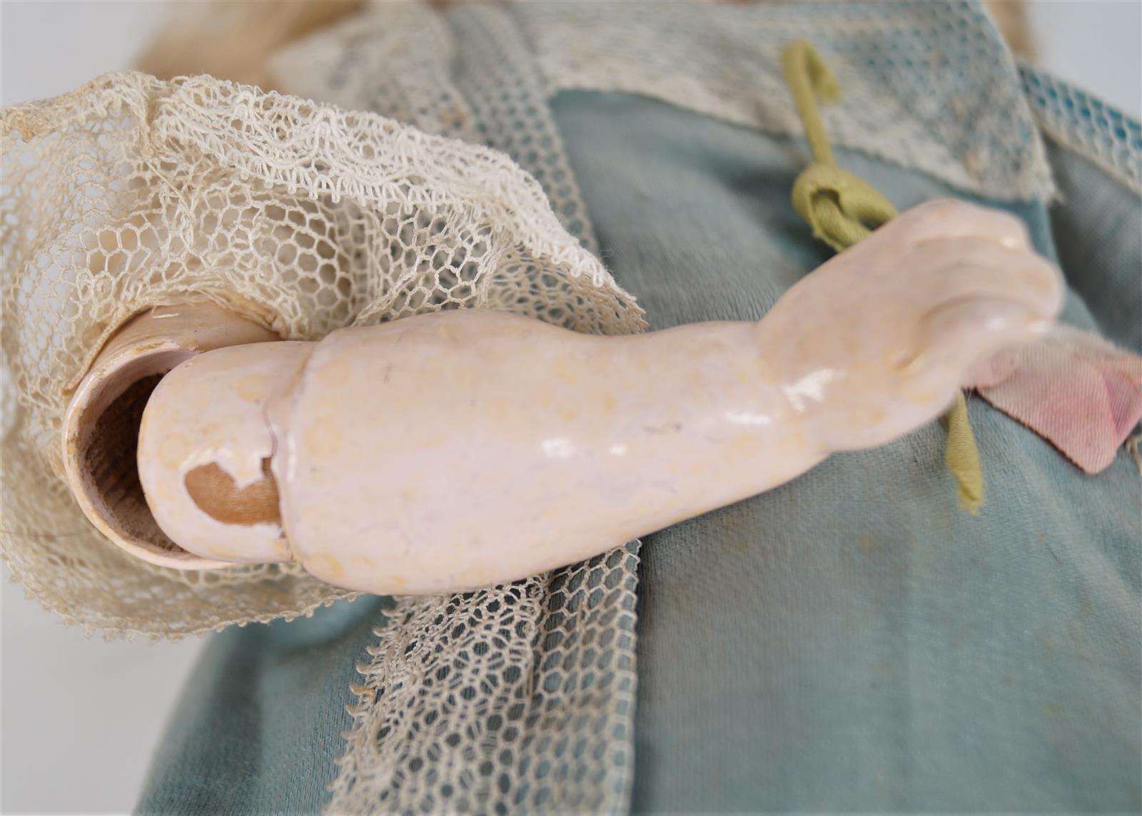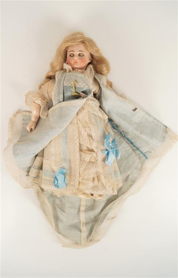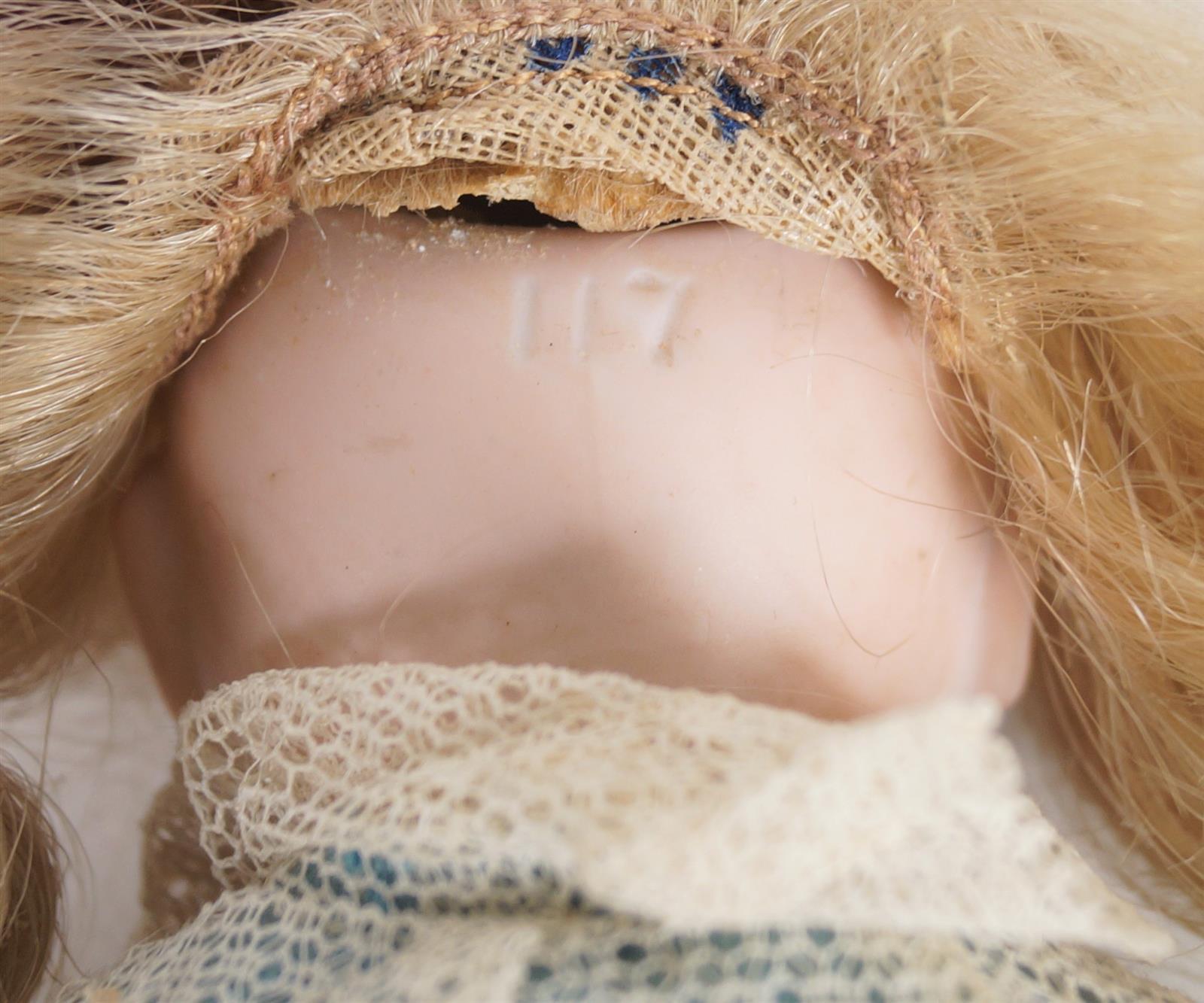 Jolie poupée allemande, tête en biscuit, moule 117, bouche fermée et yeux bleus dormeurs, corps tout articulé à boules d'origine, beaux habits et sous-vêtements en soierie bleue et dentelle, perruque blonde, H. 27 cm (légères écaillures au bras).