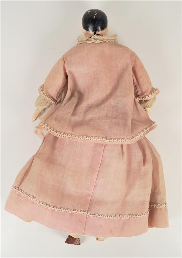 Jolie poupée dite "Pauline", tête et buste de Nuremberg, yeux en verre émaillé, corps raide en peau, habits en tulle d'origine, H. 37 cm (accident à la tête).