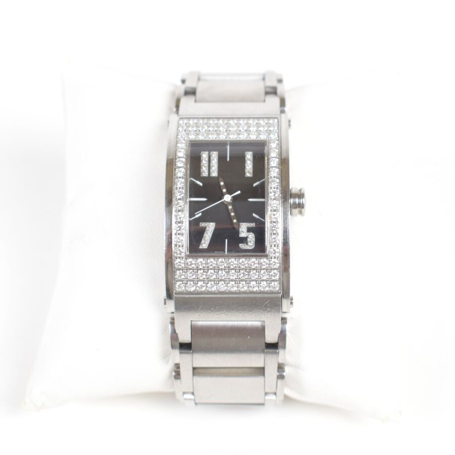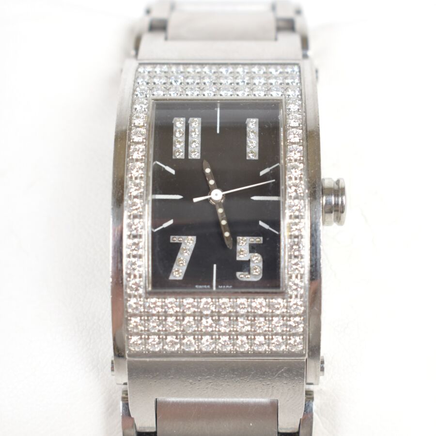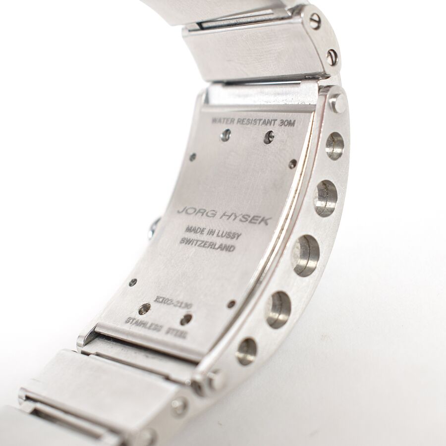 JORG HYSEK : Montre modèle "KILADA", boîtier rectangulaire en acier à fond vissé, signé au dos et marqué "WATER RESISTANT 30 M - MADE IN LUSSY- SWITZERLAND", lunette pavée de diamants, cadran noir à index appliqués sertis, aiguilles argentées, chiffres arabes, bracelet en acier à maillons articulés, fermoir déployant. Mouvement : Quartz. Numérotée K102-2130, Long. Boitier : 3.9 cm x Larg. Boitier : 1.9 cm. (micros rayures sur le bracelet en acier).