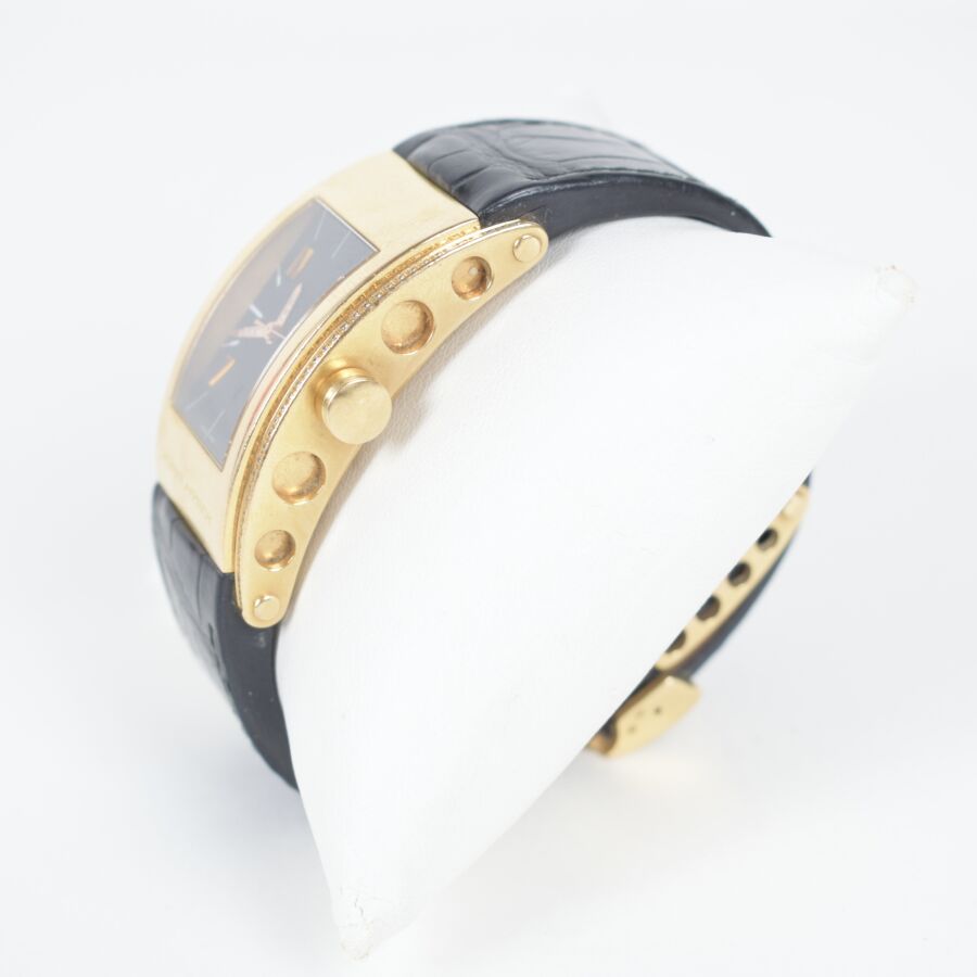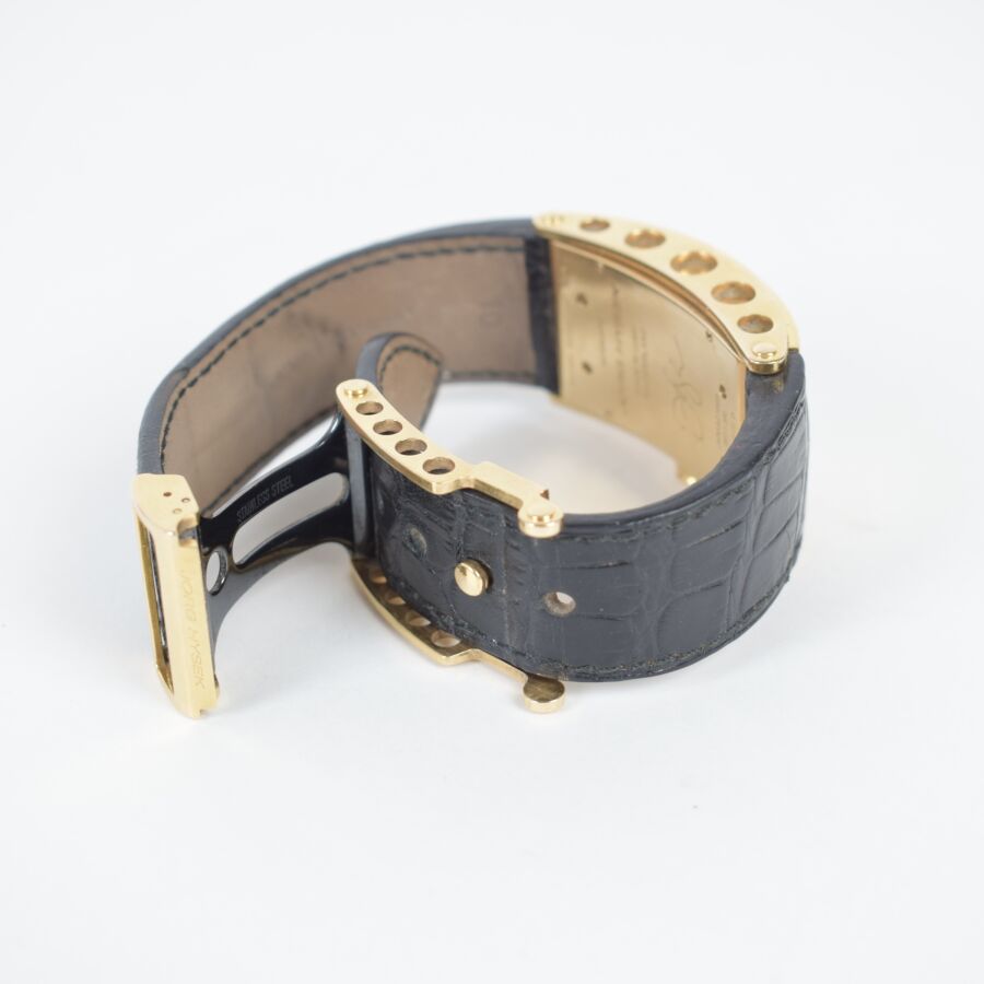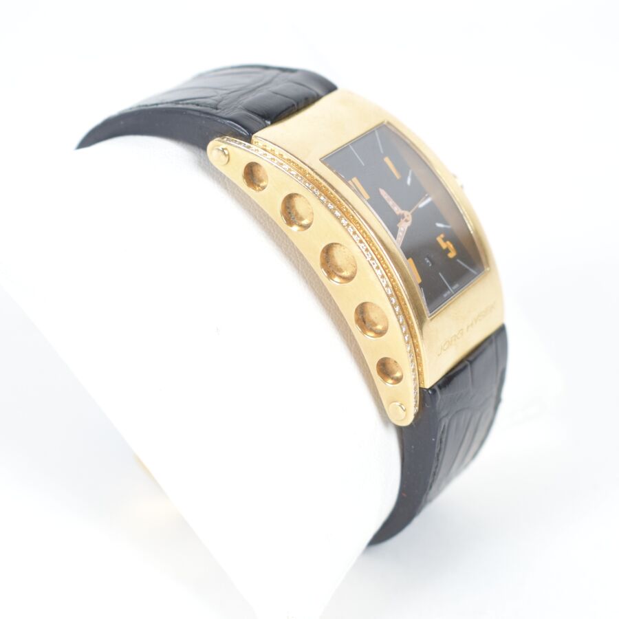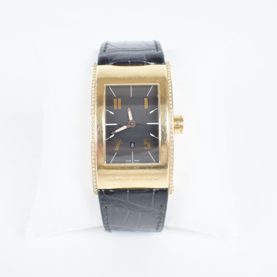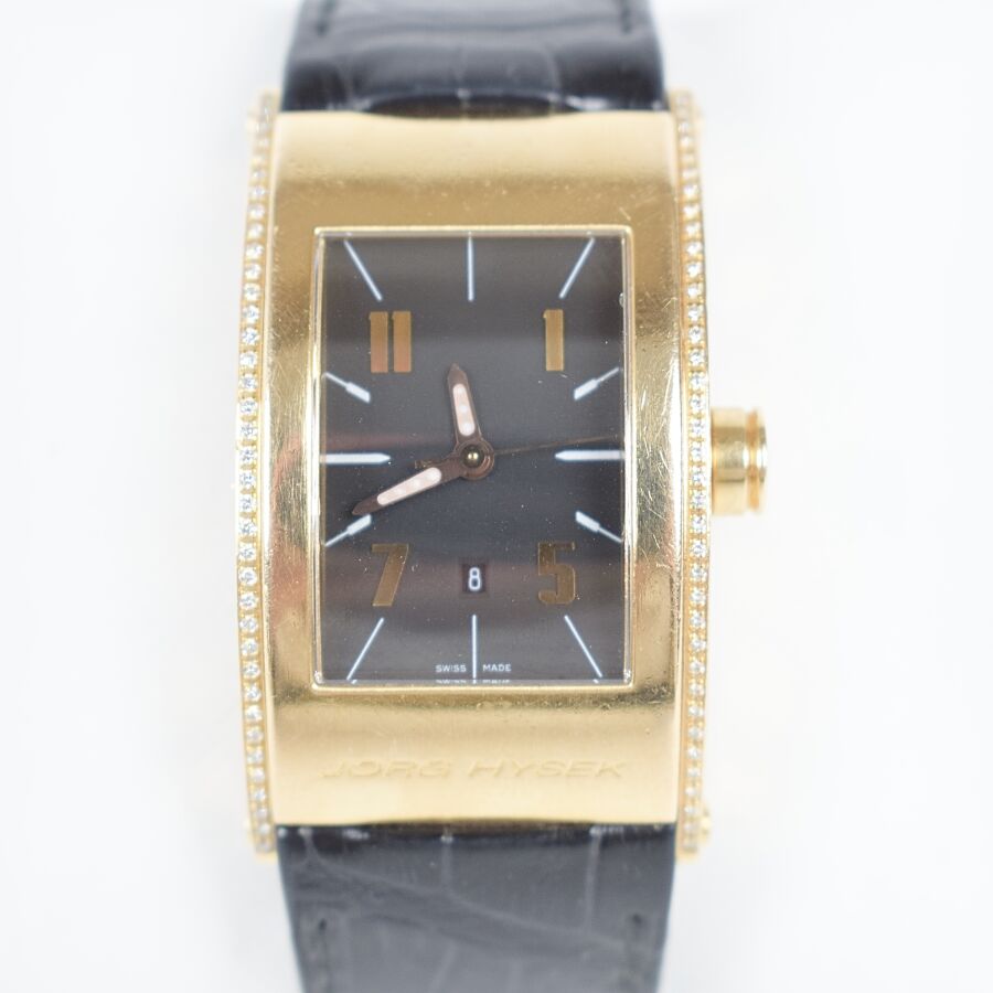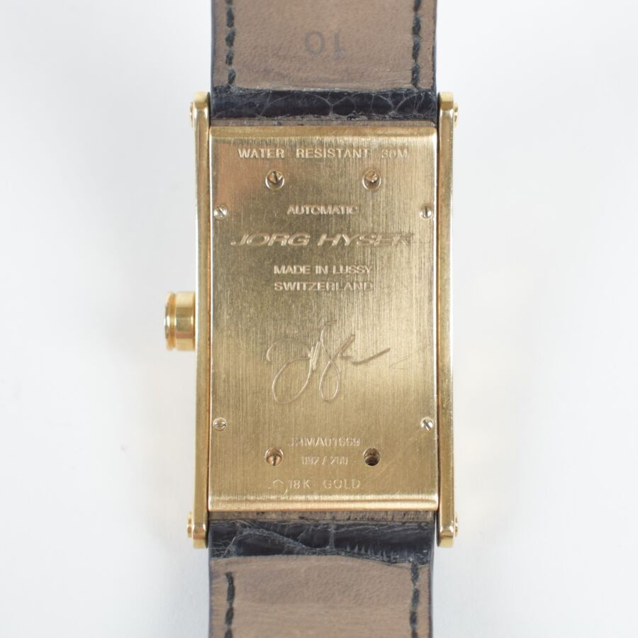JORG HYSEK : Montre modèle "'KILADA", le boîtier rectangulaire en or 18K (750/oo) à fond vissé, signé "JH" et marqué "WATER RESISTANT 30 M - MADE IN LUSSY- SWITZERLAND" au dos, décoré de deux lignes diamantées, chiffres arabes, bracelet en cuir à boucle déployante. Mouvement : calibre mécanique à remontage automatique. Numérotée JHMAQ1669, 092/200, Long. Boitier : 4.4 cm x Larg. Boitier : 2.3 cm. (micros rayures sur le boîtier).