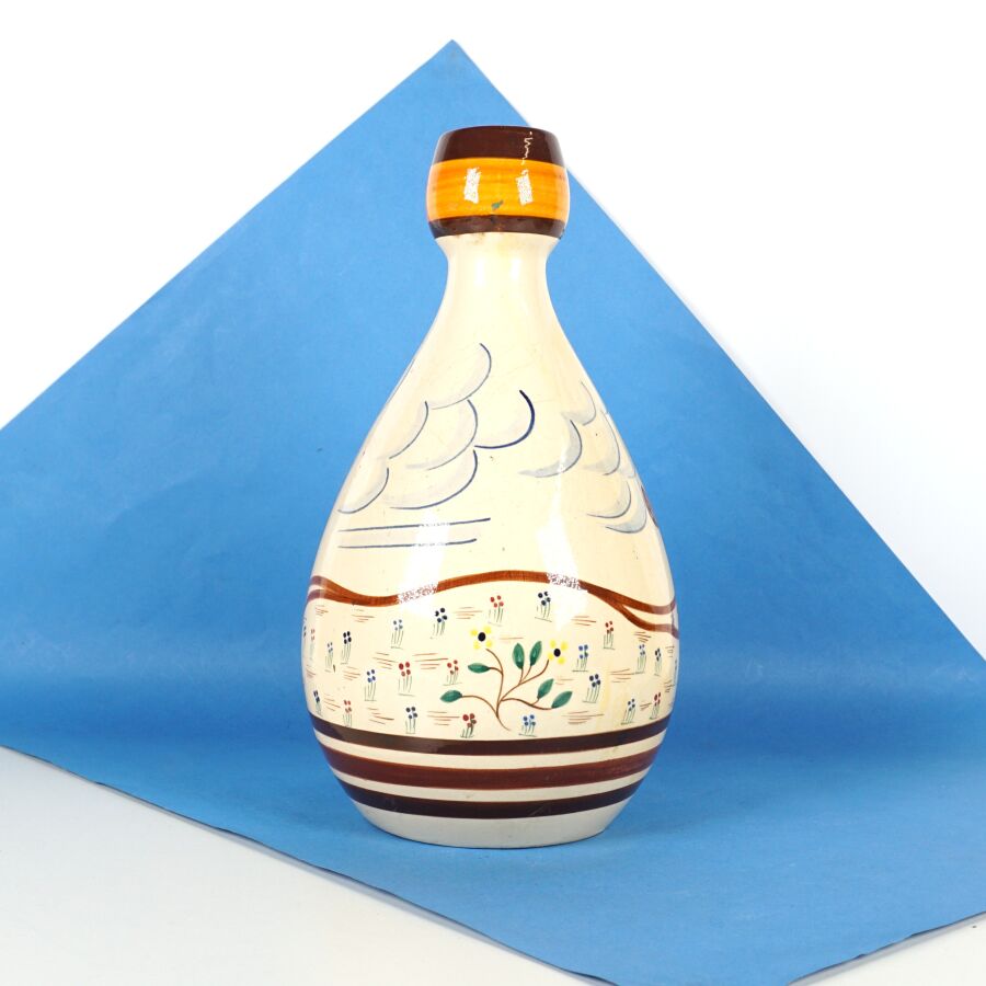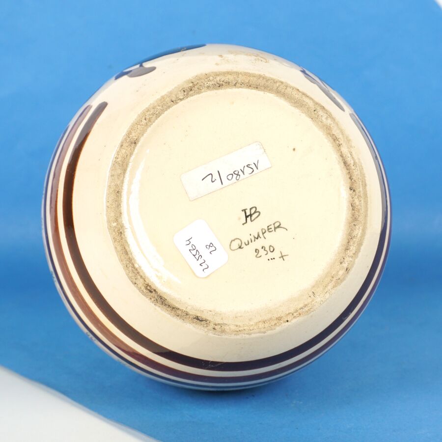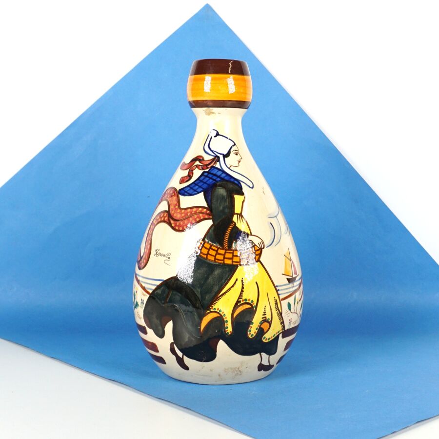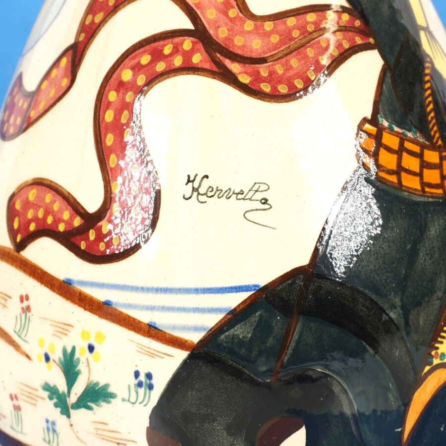Jos KERVELLA (1915-1946) - HB QUIMPER : Vase piriforme à col renflé en faïence émaillée polychrome à décor tournant d'une bretonne, signé sur le corps, H. 31.5 cm.