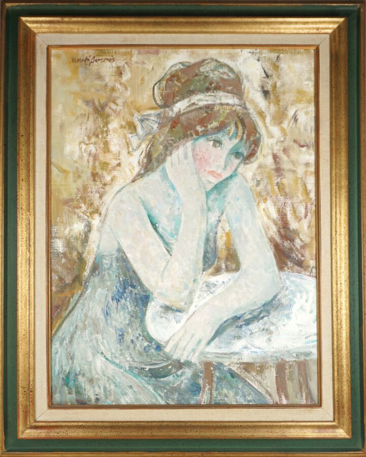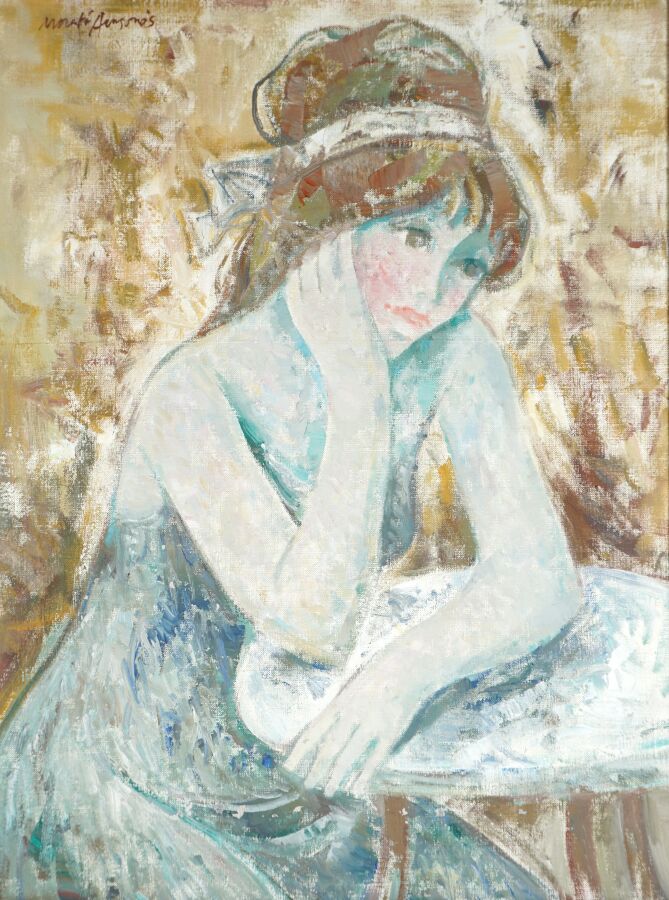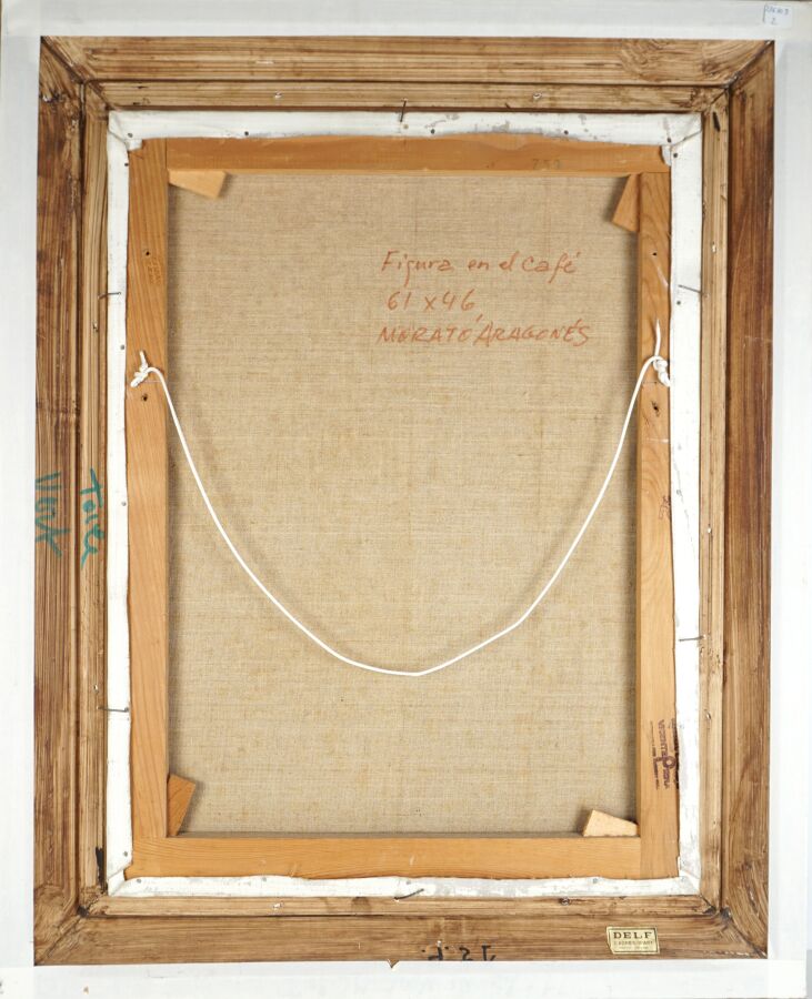 Josep Maria MORATO ARAGONES (1923-2006), "Figura en el café", huile sur toile signée en haut à gauche, contresignée et titrée au dos, 61 x 46 cm (manques).