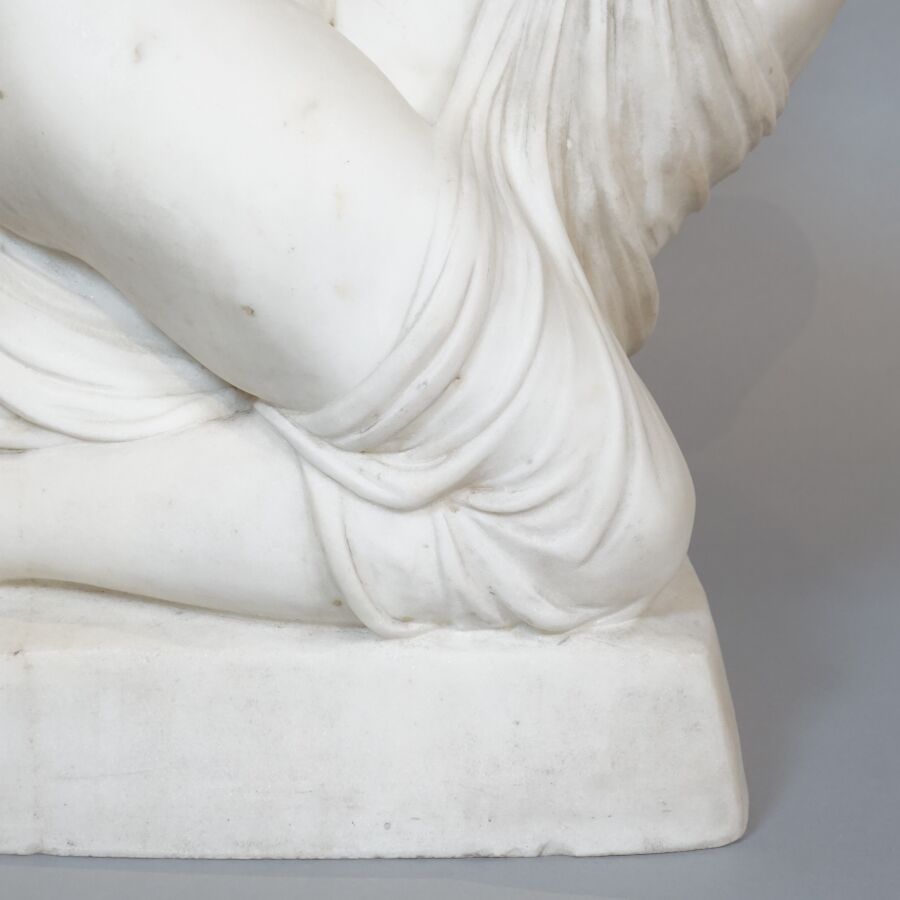 Joseph Emmanuel CORMIER dit Joe DESCOMPS (1869-1950), "L'aurore", sculpture en marbre blanc probablement de Carrare, signée en creux à l'arrière et marqué sur le socle "F.Barbedienne, Paris", H. 71 cm x 33 cm (deux restaurations ancienne au poignet droit et à l'avant-bras droit, égrenures).