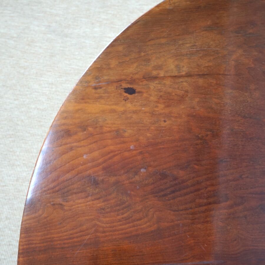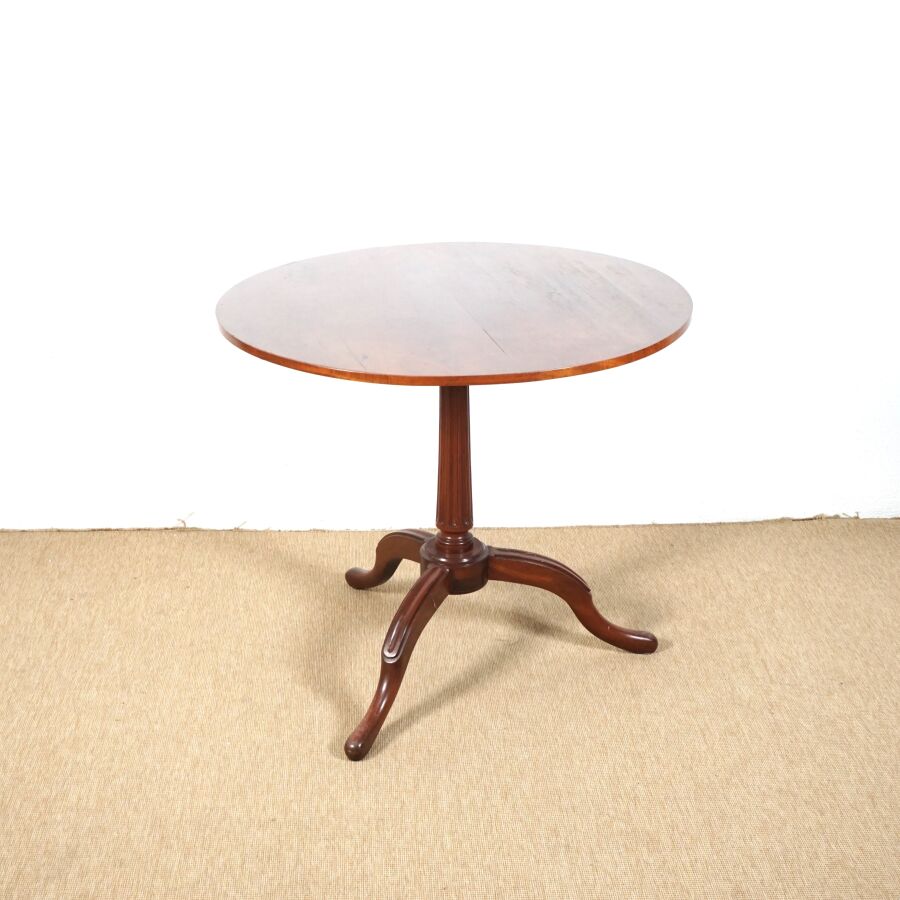 Joseph GENGENBACH, dit CANABAS, reçu maître en 1766 : Guéridon tripode en acajou, plateau pivotant, fût cannelé, estampille en haut du pivot, H. 71 cm. D. 80.3 cm (tâches, rayures).