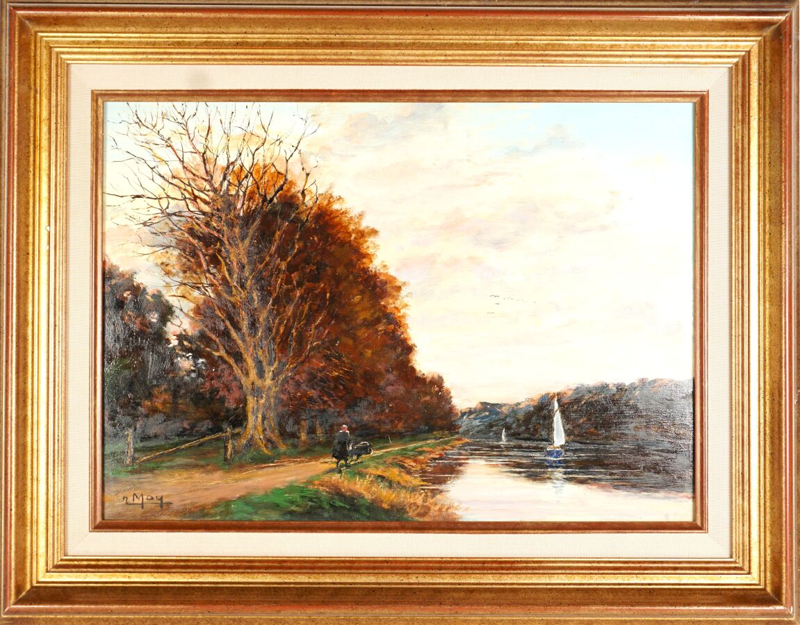 Joseph MOY (1905-1992), "Promenade sur les bords de la Vilaine (le Boël)", huile sur isorel signée en bas à gauche, située au dos, 32.5 x 46 cm.