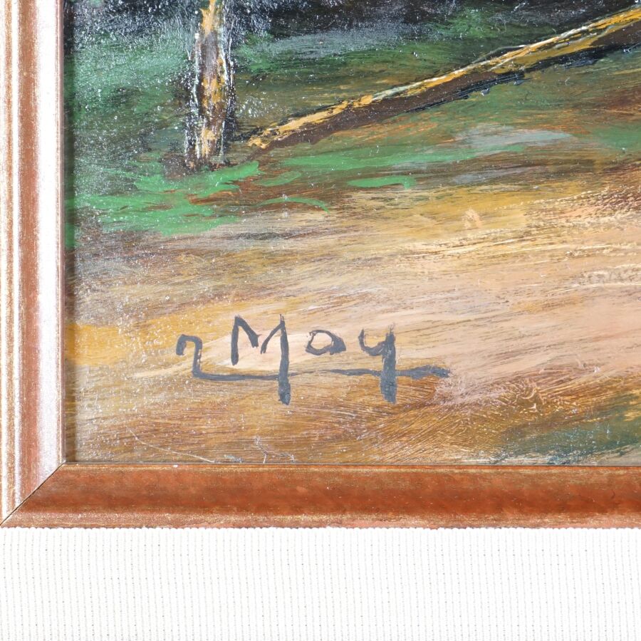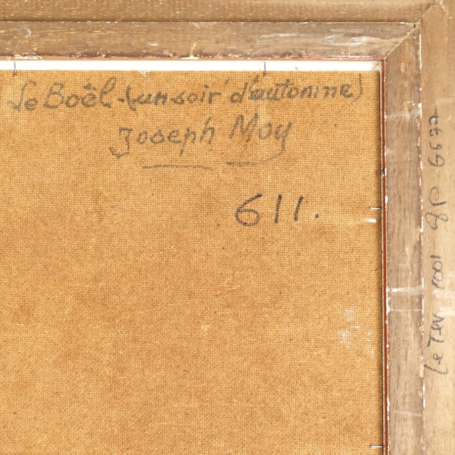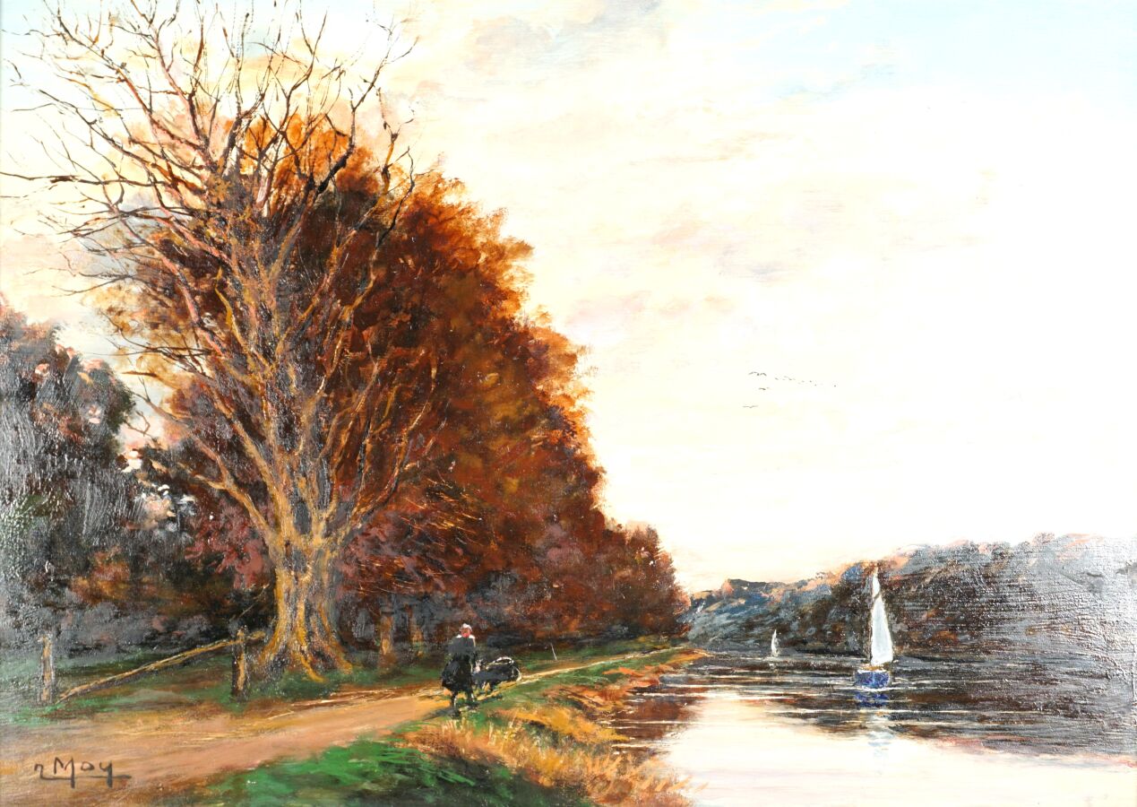 Joseph MOY (1905-1992), "Promenade sur les bords de la Vilaine (le Boël)", huile sur isorel signée en bas à gauche, située au dos, 32.5 x 46 cm.