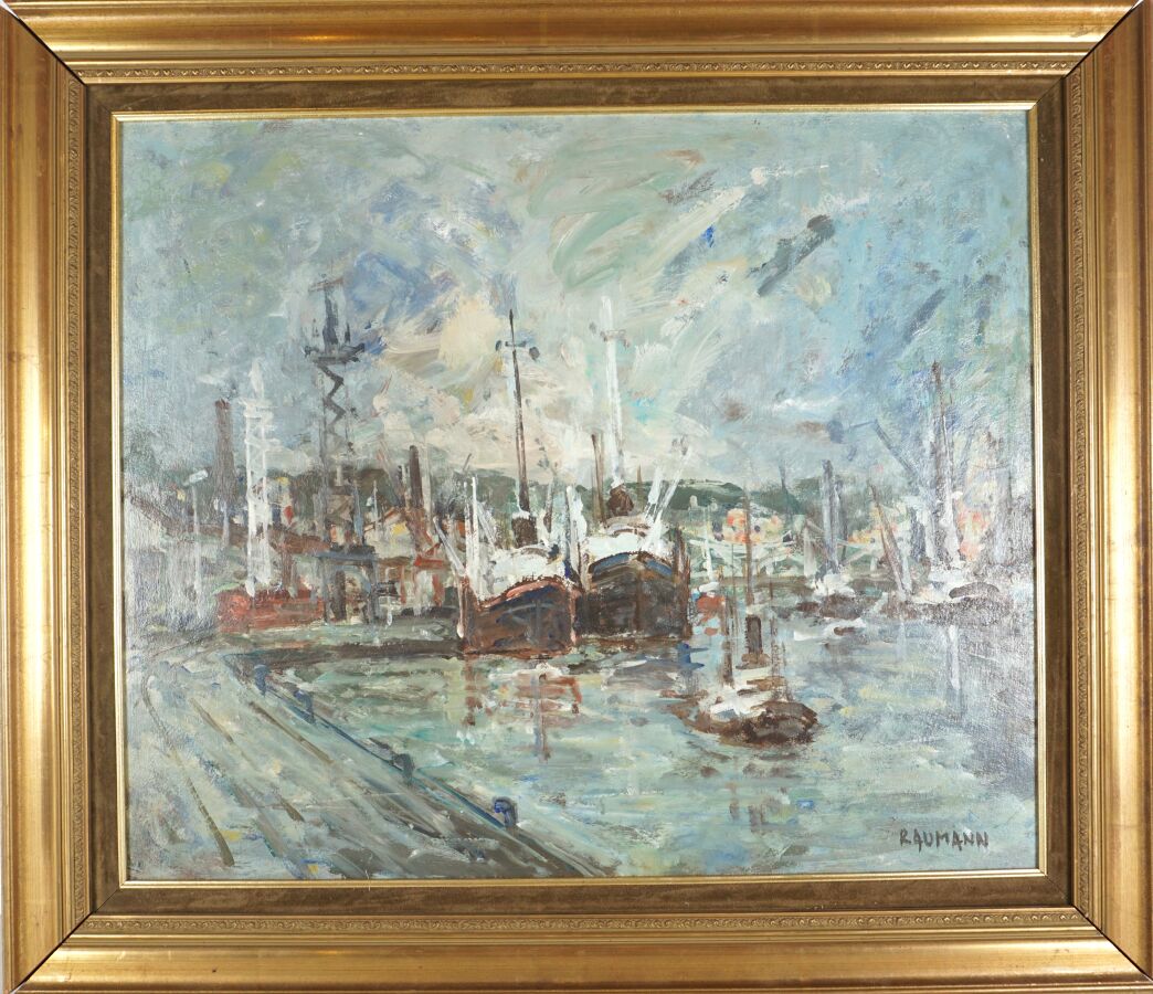 Joseph RAUMANN (1908-1999), "La Seine à Rouen", huile sur isorel signée en bas à droite, contresignée et titrée au dos, 46 x 55 cm.