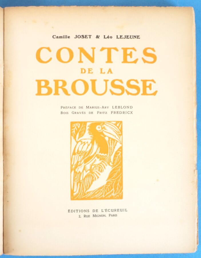 JOSET (Camille) & LEJEUNE (Léo) - Contes de la Brousse - Paris ; Éditions de l'Écureuil, 1939 - 1 volume In-4° broché sous couverture illustrée - Quelques rares rousseurs éparses - Bois gravés en couleurs de Fritz Fredricx.