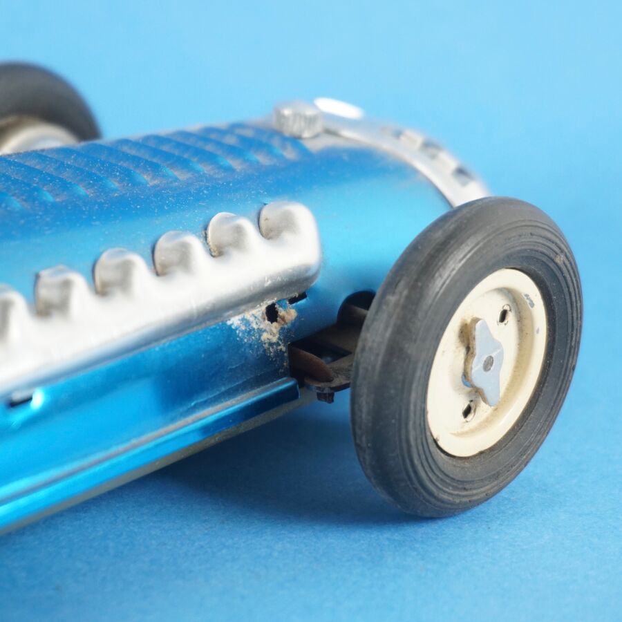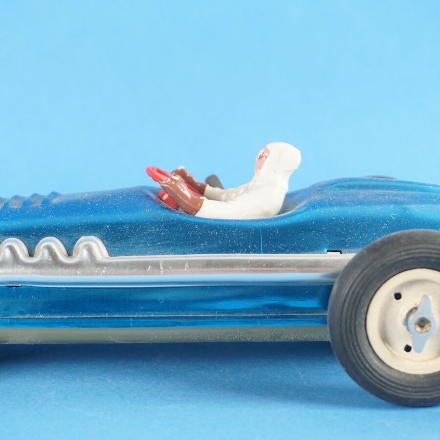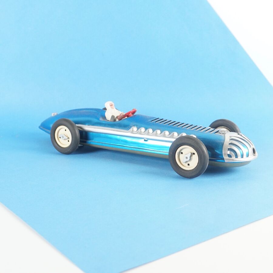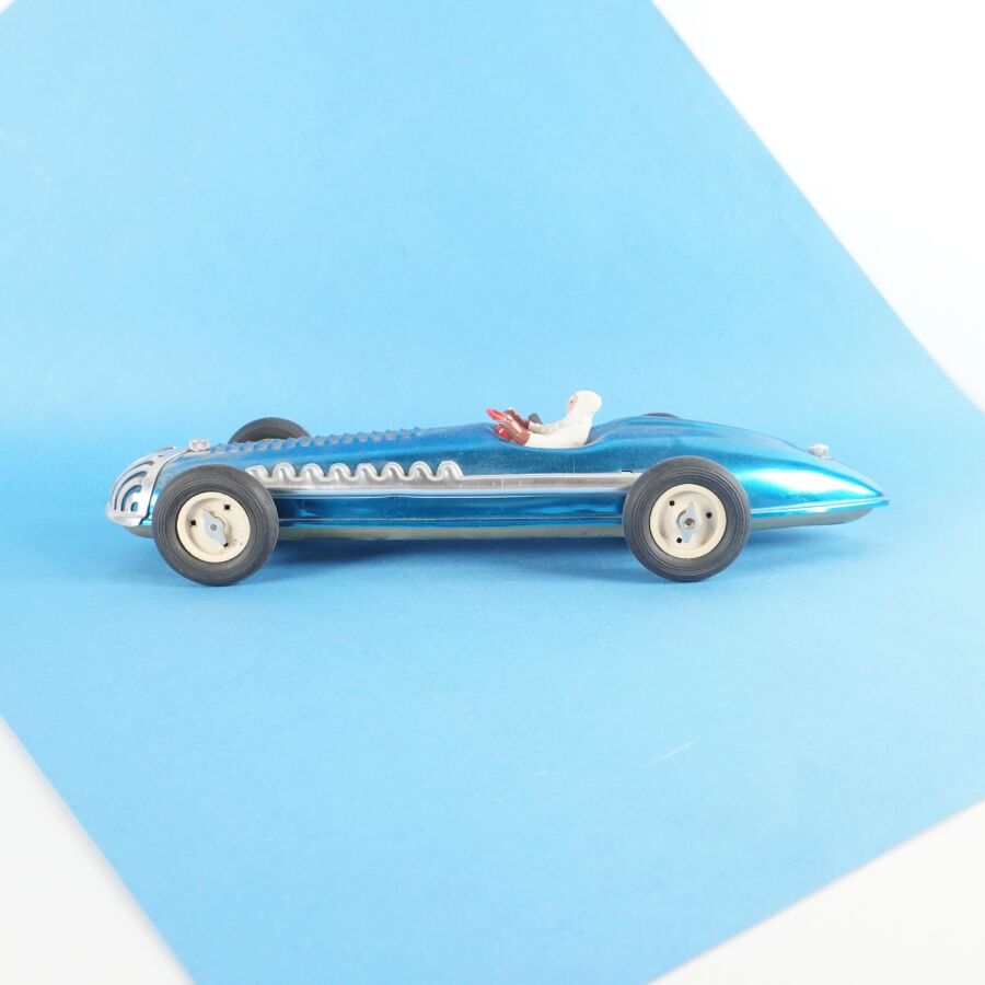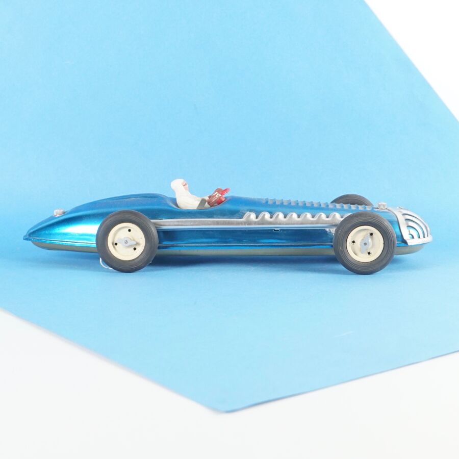 JOUEF : Auto-course électrique, bleue, avec conducteur, présentée dans sa boîte d'origine (en l'état, déchirures, manques des languettes, infimes traces).