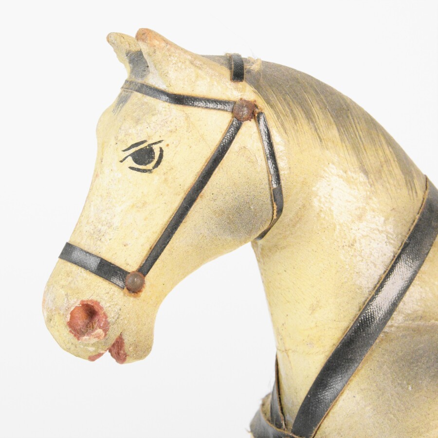Jouet sur roulettes représentant un cheval de trait en bois peint, harnachement en simili cuir noir, reposant sur un plateau de bois rectangulaire, H. 29 cm, L. 31.5 cm (usures et manques).