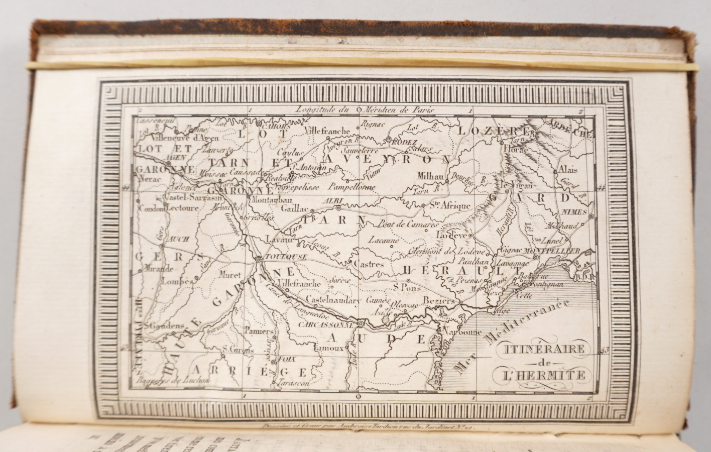 JOUY (M. de) - L'Hermite en province ou observations sur les moeurs et les usages français au commencement du XIXème siècle - Paris ; Pillet, 1818-1819 - 2 volumes In-12° - Frontispices, 2 cartes, 2 planches hors texte et vignettes in texte gravées en noir - Reliure de l'époque basane havane marbrée (des frottements et petites épidermures, coins frottés voire usés) - Dos lisses ornés - Pièces de titre papier orange, pièces de tomaison papier noir - Tranches jaunes mouchetées - Mention de 4ème édition pour le tome I (1818), et de 2nde pour le tome II (1819)