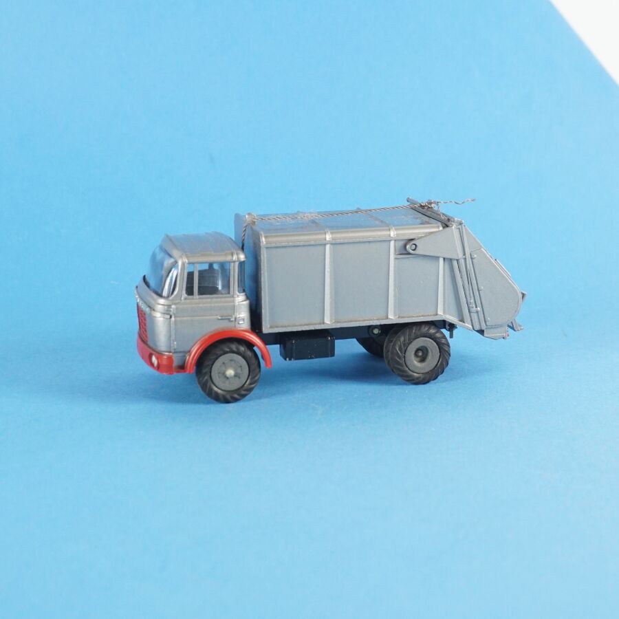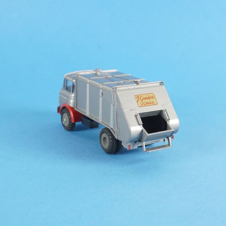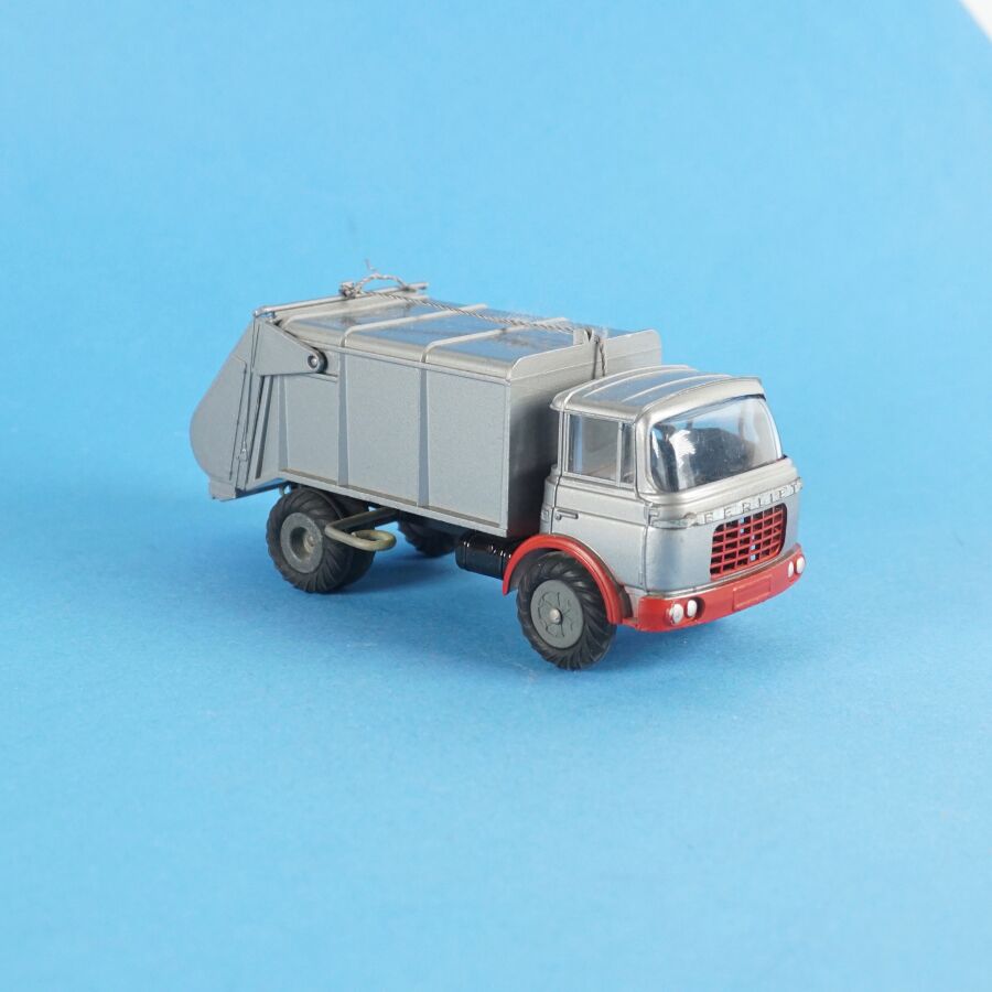 JRD : Benne à ordures « Genève », sur châssis Berliet, couleur gris métallique et rouge, avec système de levage fonctionnel, présentée dans sa boîte d'origine (usures à la boîte, quelques légères traces, bel état).