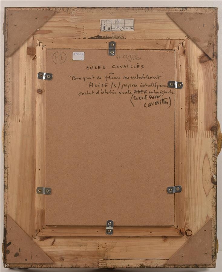 Jules CAVAILLES (1901-1977), "Bouquet de fleurs", huile sur papier marouflé sur panneau, cachet de la vente Ader du 14 mars 2012, 31 x 23 cm.