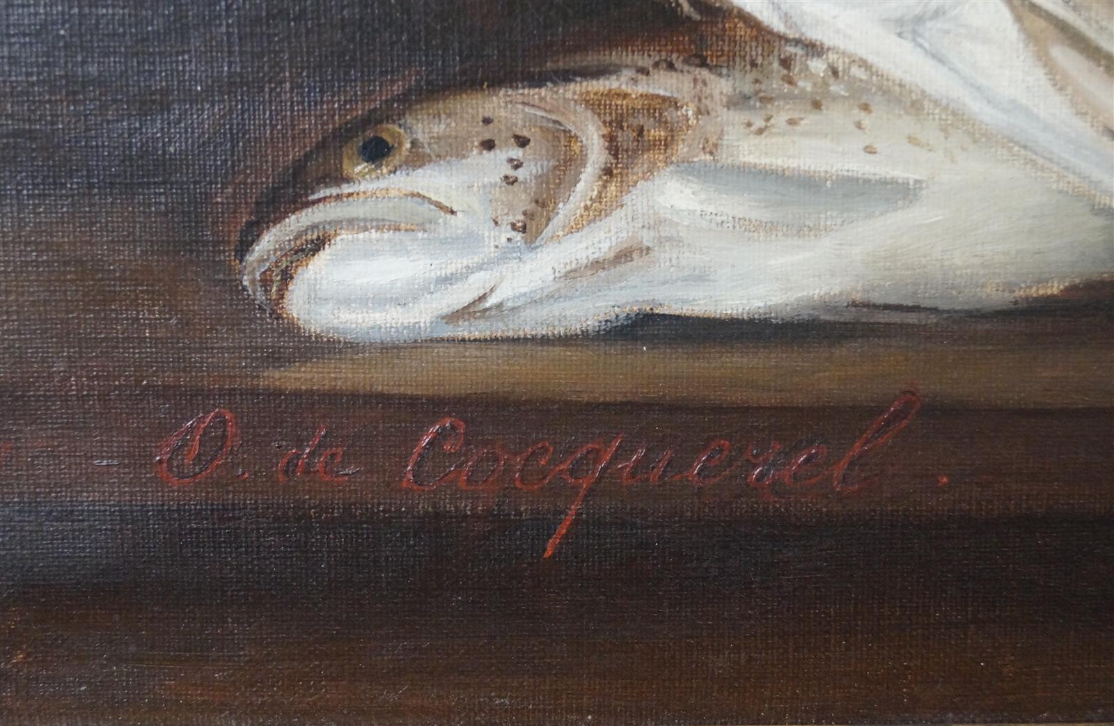 Jules J. Olivier DE COCQUEREL (1838-1903), "Cuivre et terre-cuite aux deux truites farios", huile sur toile signée en bas à gauche, 32 x 46 cm